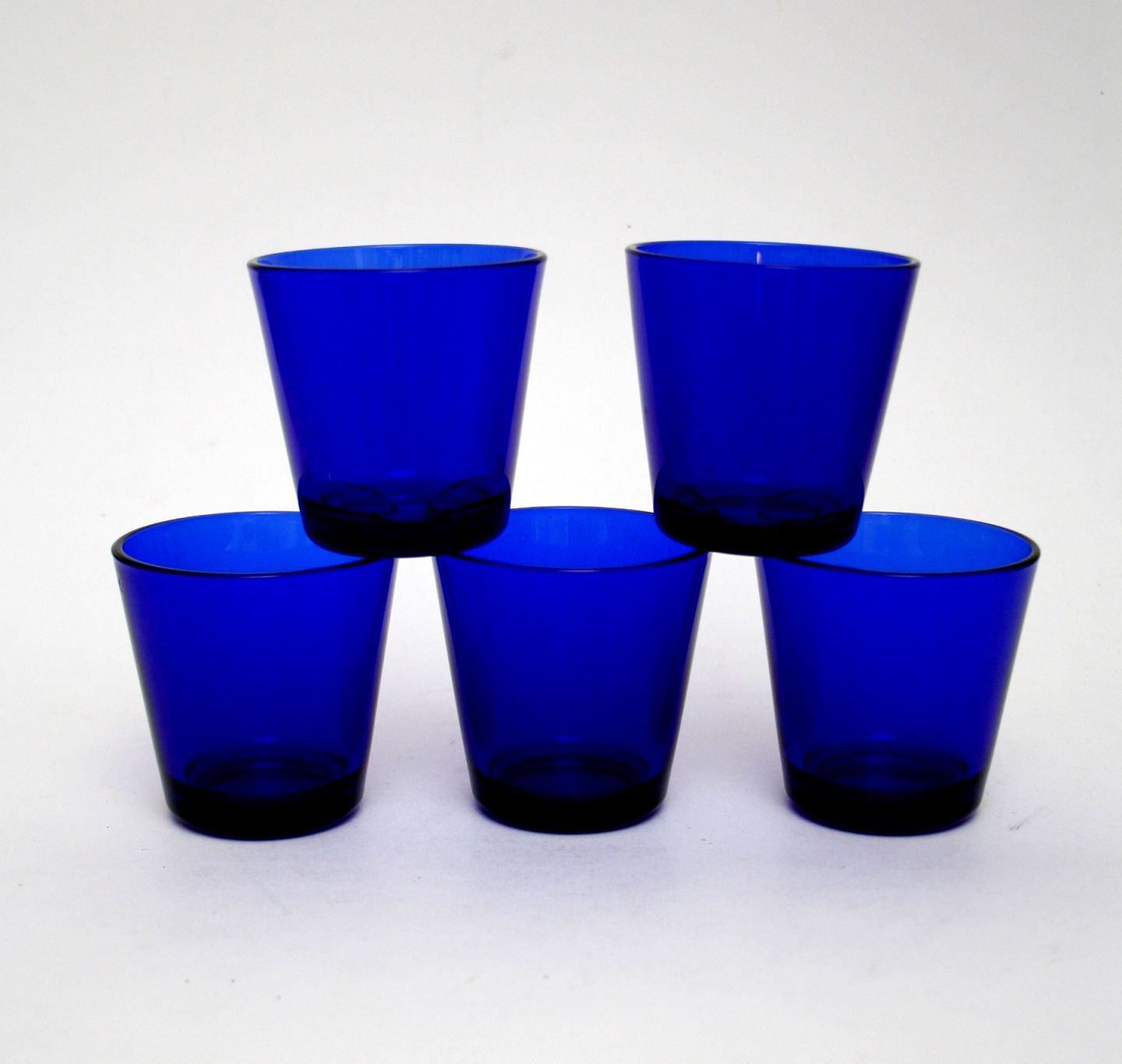 Nuutajarvi Nottsjo, Finland, Kartio blå drikkeglas designet af Kaj Franck. Signatur Kaj Franck. Disse er produceret i perioden 1950'erne-1960'erne. Iittala har senere taget produktion op igen af 2 omgange. Højde 8 cm. Øverste diameter 8 cm. Pris: 150 kr. stk. Lager: 5