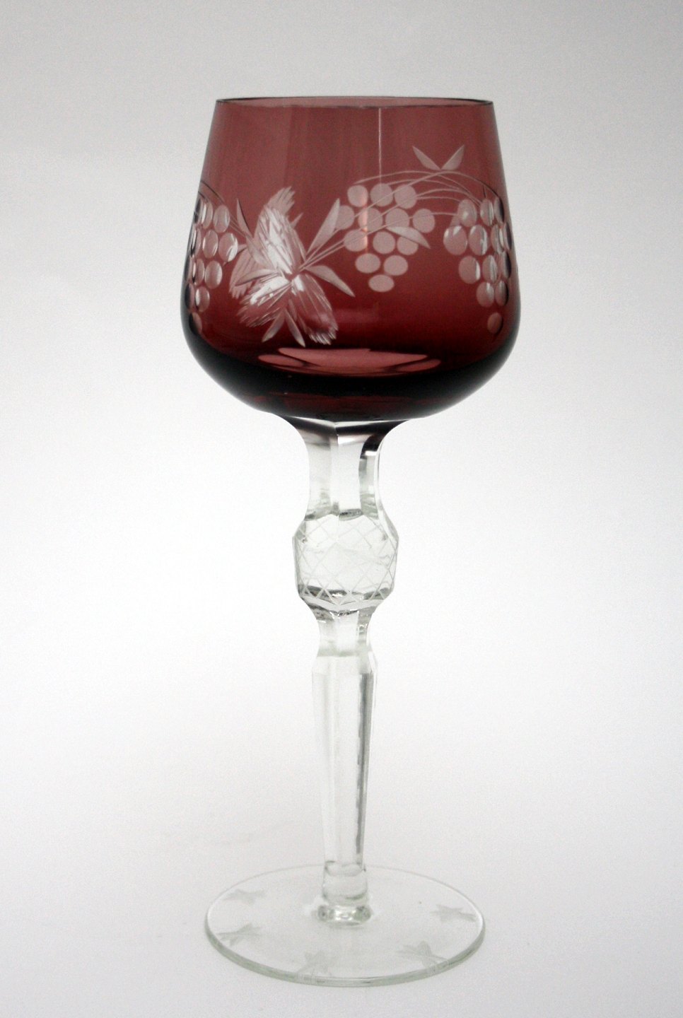 Bøhmisk krystal, Vinglas i flere farver. Kumme med druer, blade og stjerner. Slebet stilk. Højde 21,5 cm. Pris: 250 kr. stk.
