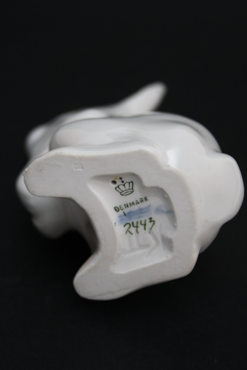 Royal Copenhagen, Kanin siddende på bagben. Designet af K. Otto. Nr. 2443. Stemplet med gammel krone mærke. Højde 13 cm. II. sortering. Pris: SOLGT