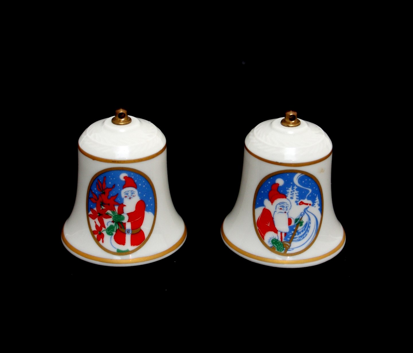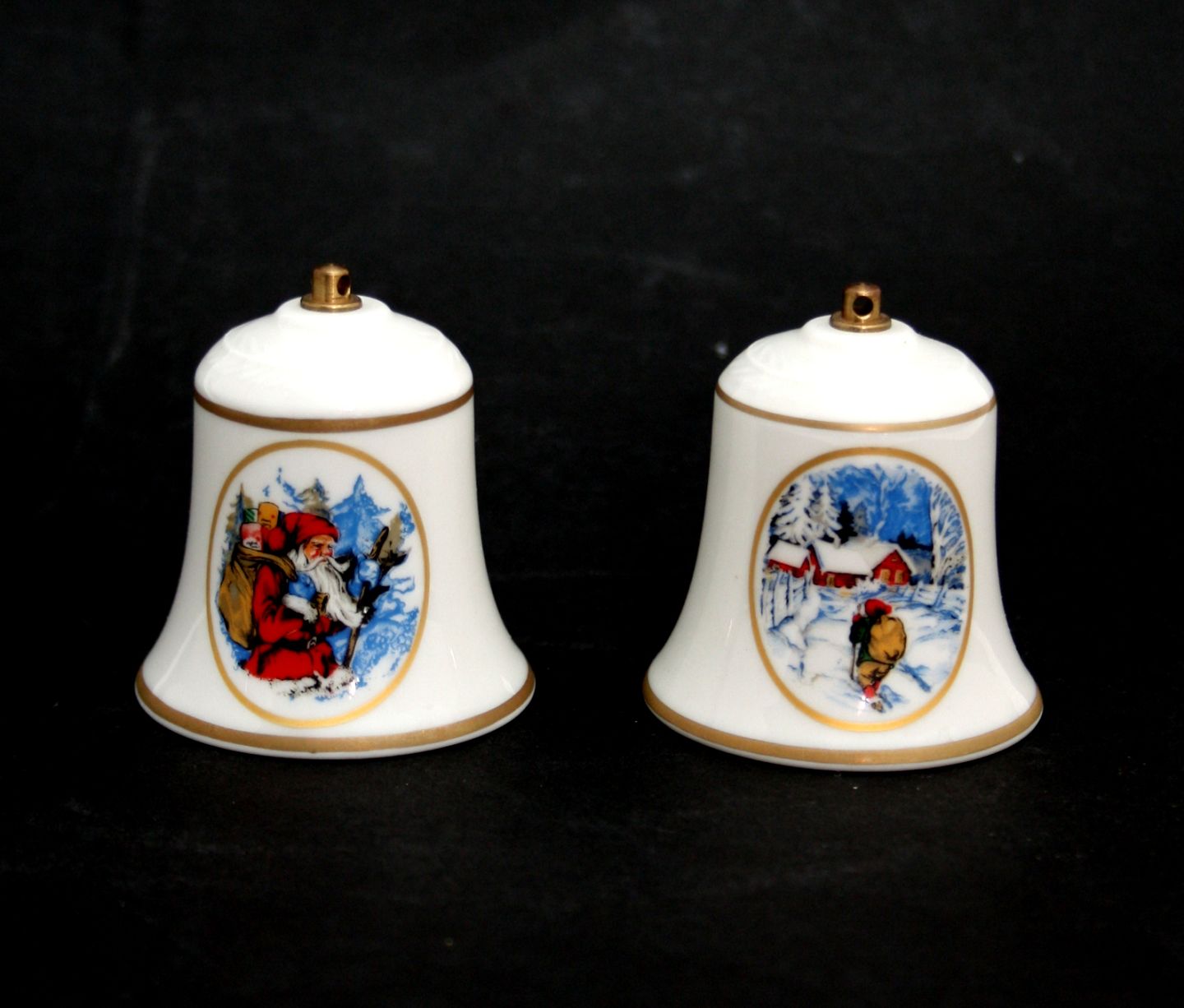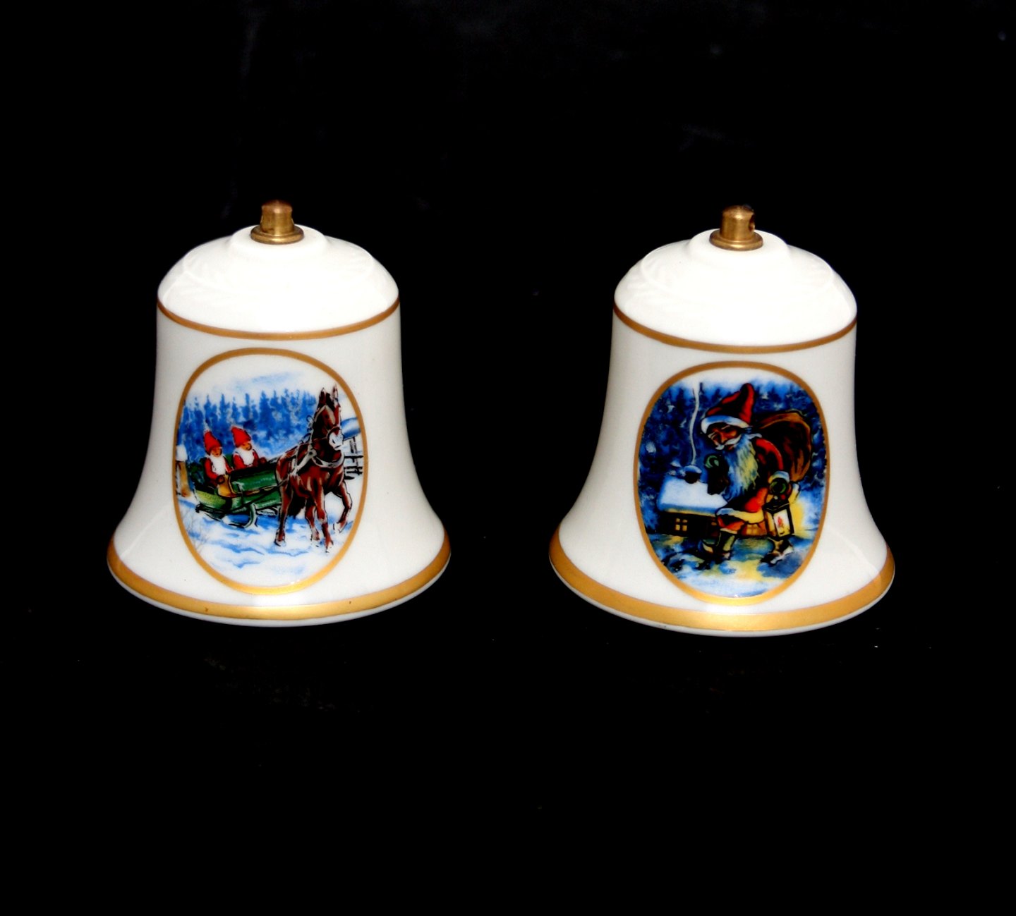 Rørstrand, Juleklokker med 2 klokker i originalæske. Porcelæn med messing ophæng og klokke. Pris: 175 kr. pr. sæt.
