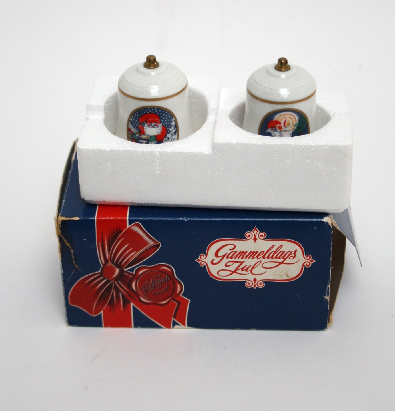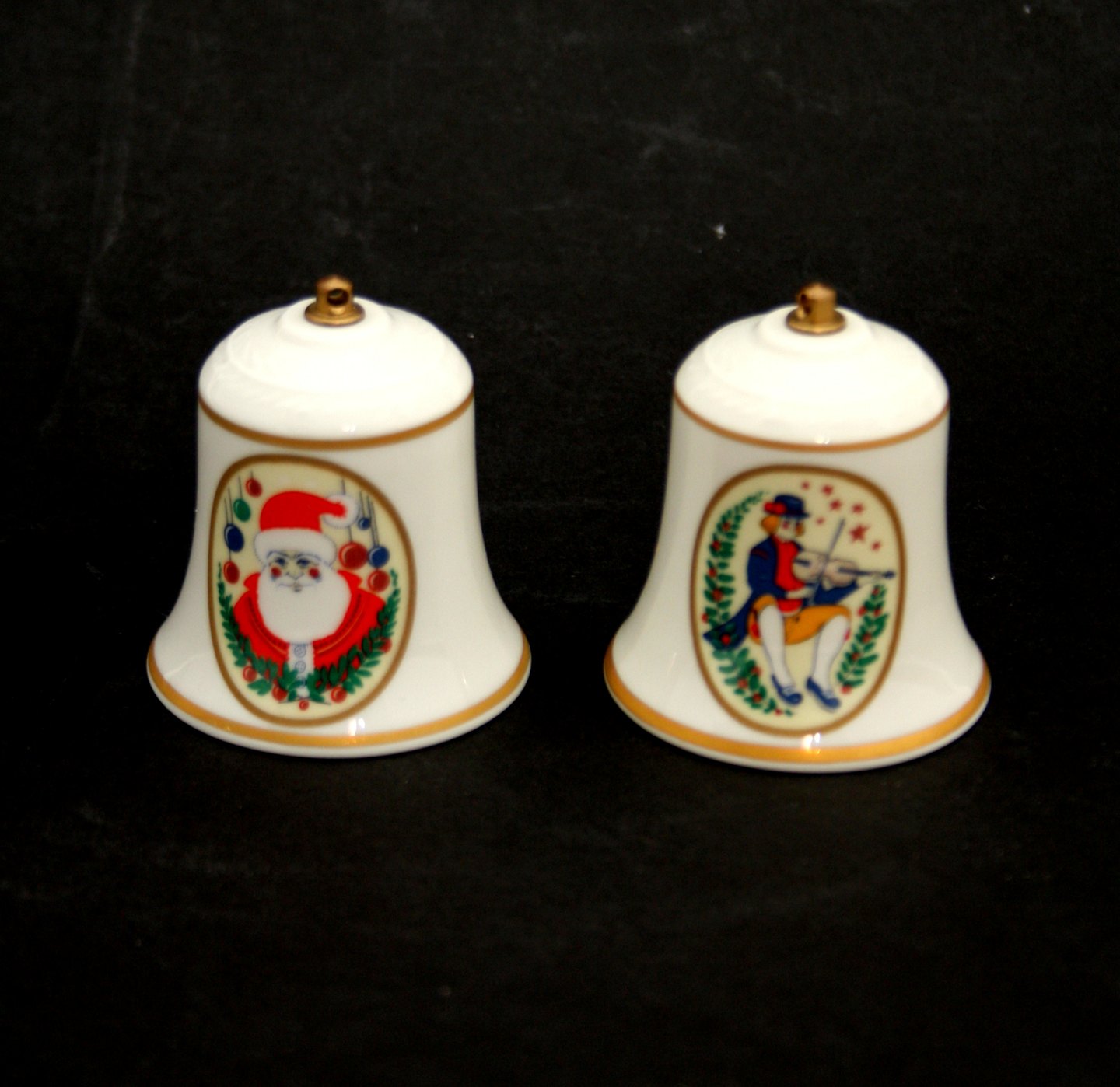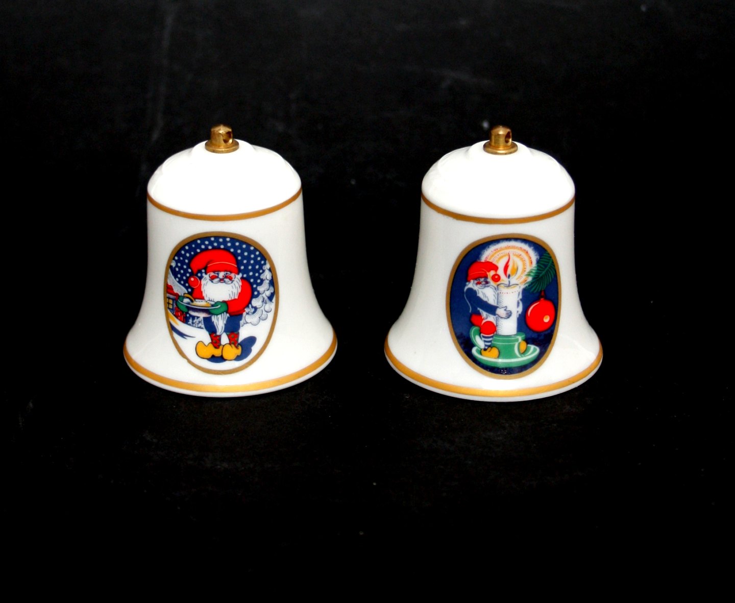 Rørstrand, Juleklokker med 2 klokker i originalæske. Porcelæn med messing ophæng og klokke. Pris: 175 kr. pr. sæt.