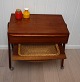 Sybord af teak, front med skuffe og udtræksskuffe med garnkurv af flet, på skråtstillede ben. H. 61,5 cm. B. 65 cm. D. 42 cm. Fremstår med enkelte mærker Pris: SOLGT