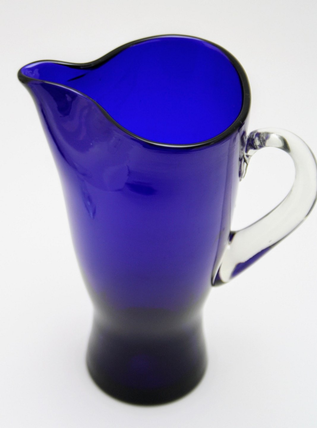 Blå glaskande med sammenpresset tud, isterningstop. Højde 21,5 cm. Fin stand. Pris: 295 kr
