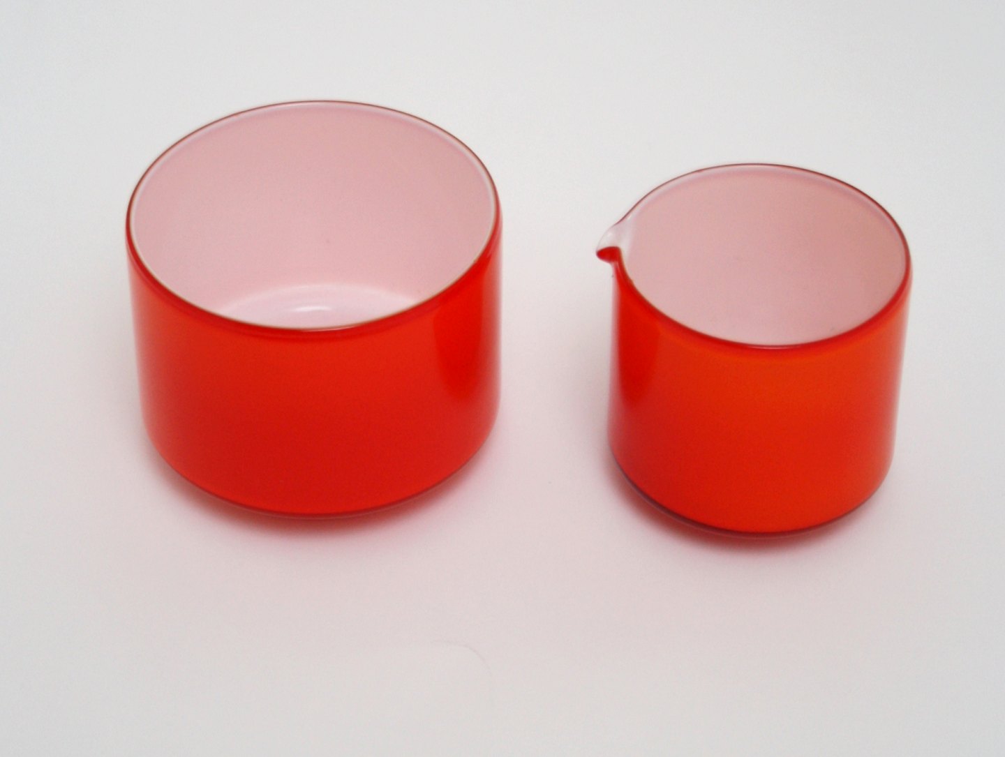 Holmegaard, Palet, Orange sukker og fløde sæt. Designet af Michael Bang. Sukkerskål. Højde 6,5 cm. Diameter 8 cm. Flødekande. Højde 6,5 cm. Diameter 6,5 cm. Flot stand. Pris: sælges samlet 400 kr.