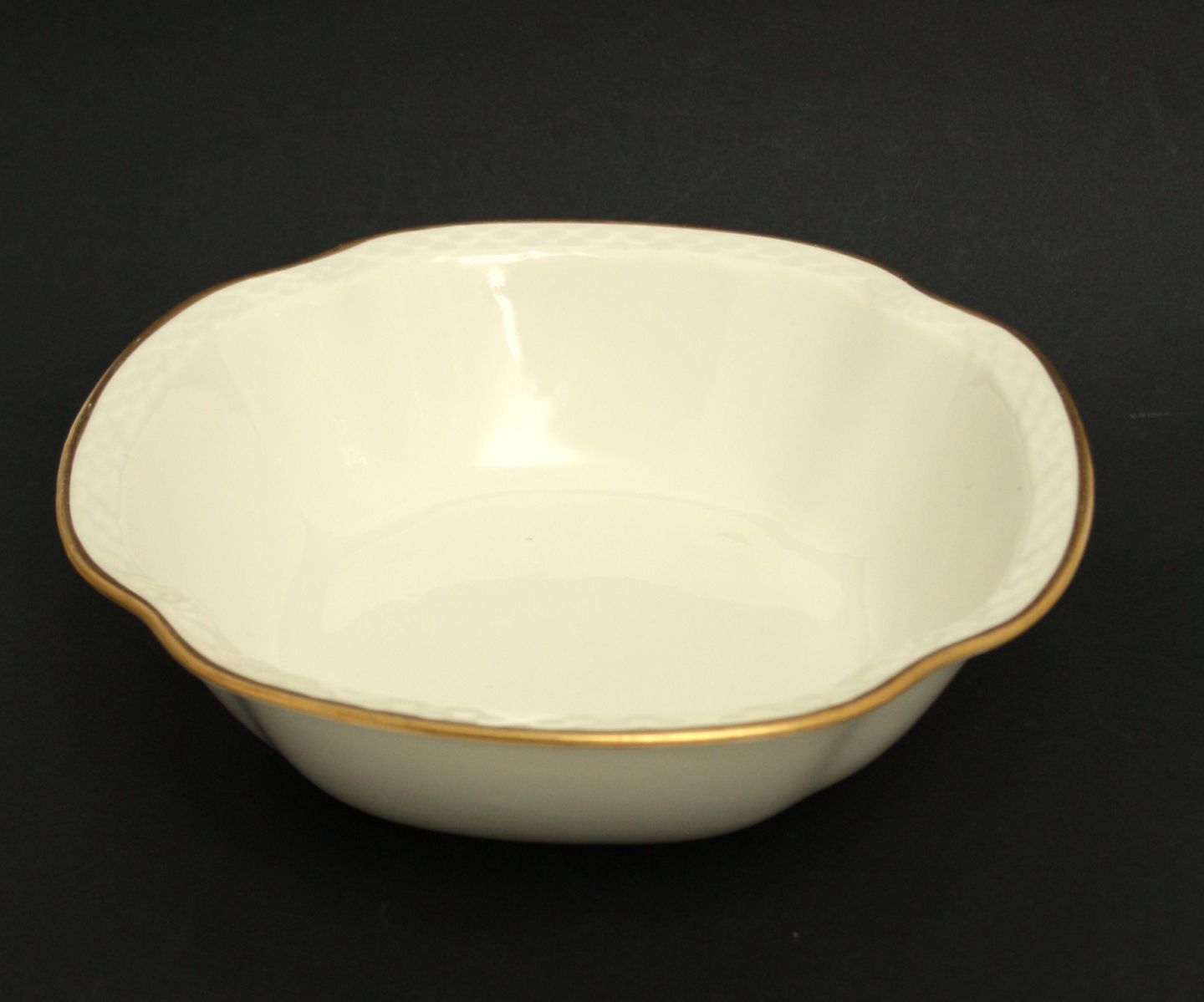 Bing & Grøndahl, Aakjær, creme med guldkant. Kartoffelskål. Dek.nr. 43. længde 24,5cm. højde 7 cm. 2. sortering, fin og hel stand. Pris: SOLGT