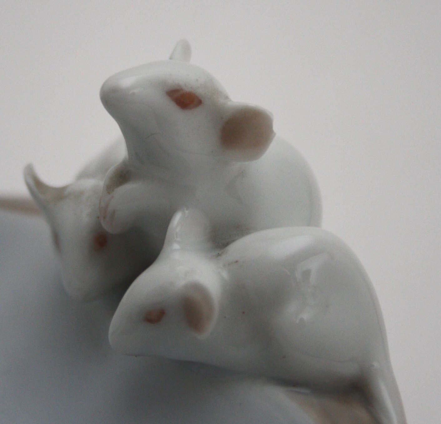 Royal Copenhagen, Ugle og tre mus på fad/skål. Designet af Chr. Thomsen i 1904. Højde 13 cm. Længde 14,5 cm. Der er afslag på det ene museøre. I. sortering. Pris: SOLGT