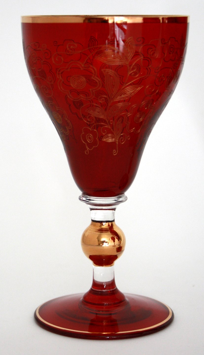 Bøhmisk rødvinsglas med guld ciseleringer. Højde 14 cm. Diameter 7cm. God stand. Pris: SOLGT