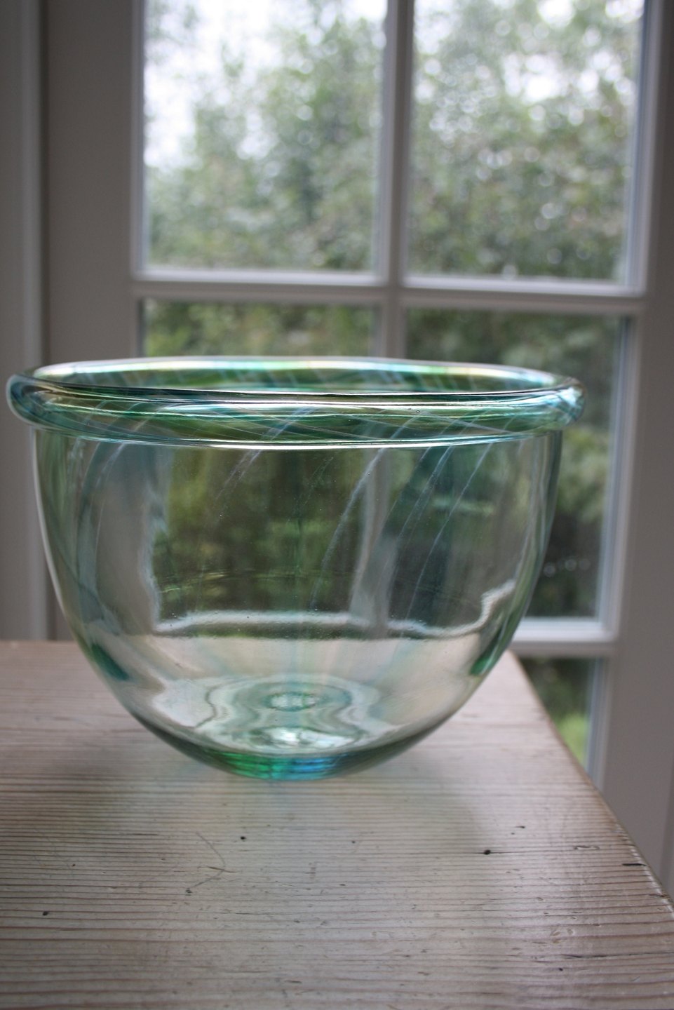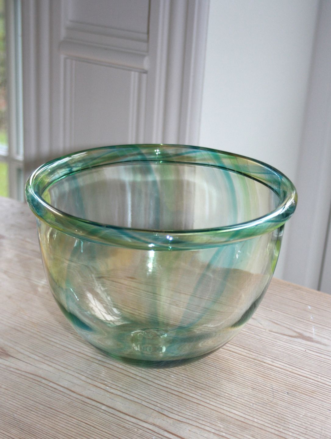 Lena Ljungar, Glasmagerne eget værksted Tåsinge sammen med Jesper Sødring. Skål i grønne nuancer. Signeret Lena Ljungar 2001. Diameter 20 cm. Højde 14,5 cm. Pris: SOLGT