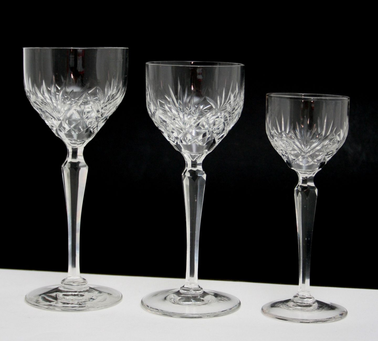 Krydsslebne glas. Rødvin. Højde 18 cm. Pris: 100 kr. stk. Lager: 3 Hvidvin. Højde 17 cm. Pris: 75 kr. stk. Lager: 5 Portvin. Højde 15 cm. Pris: 40 kr. stk. Lager: 8