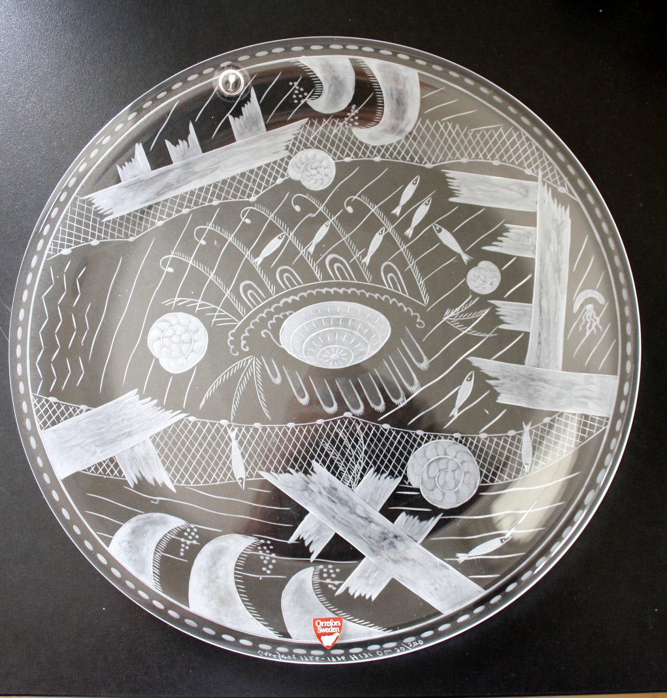 Orrefors, Den sönderslagna bryggan fra 1920 fortælling om Edward Halds skærgårdssommer. Originalen findes på Sveriges Nationalmuseum. Dette fad er signeret og fremstillet i forbindelse med Orrefors' 250 års jubilæum fra 1726-1976. Fadet er nr. 30 ud af 500 eksemplarer. Diameter 27,5 cm. Pris: SOLGT