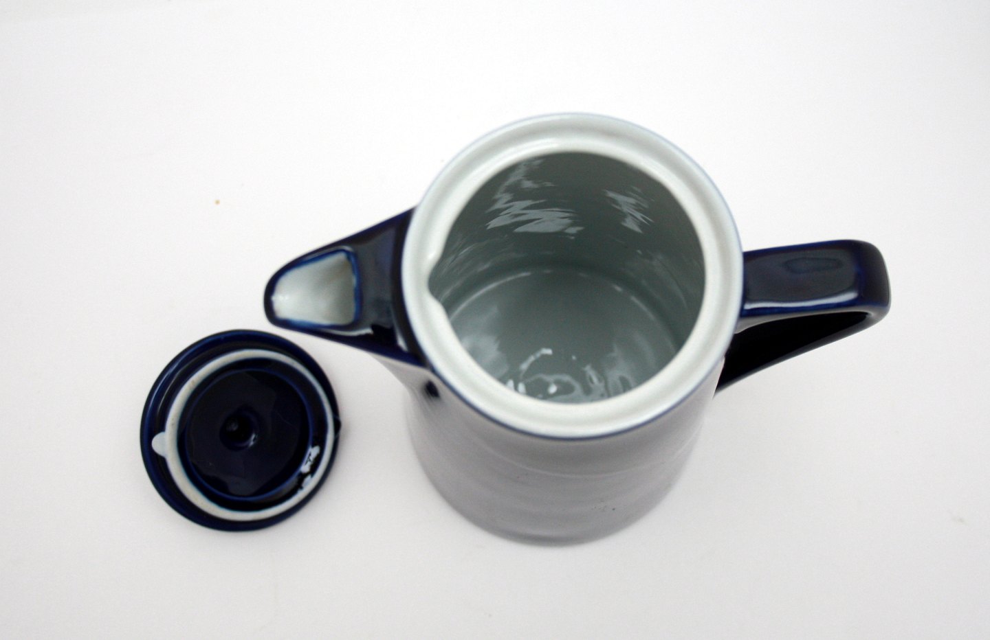 Lyngby Dan-ild med glasurfarver, blå 2600. Design Axel Brüel i 1958. Kaffekande med låg. Højde 20 cm. Længde 17 cm. Pris: SOLGT