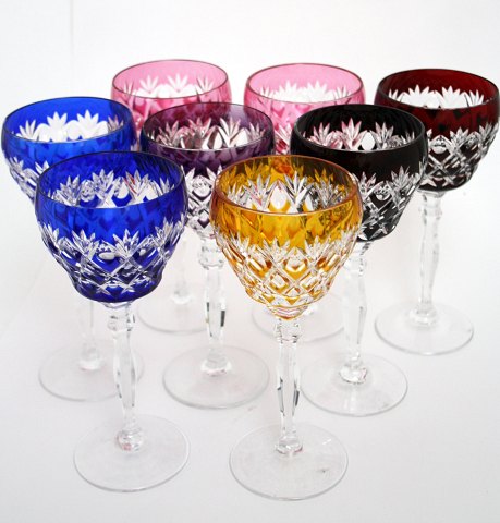 Trompetformede gamle krystalglas med oliveslibninger, facetslebet stilk med lang slebet knap. Rundslebet bund. Før 1900 tallet. Højde 13 cm. Diameter 7 cm. solgt