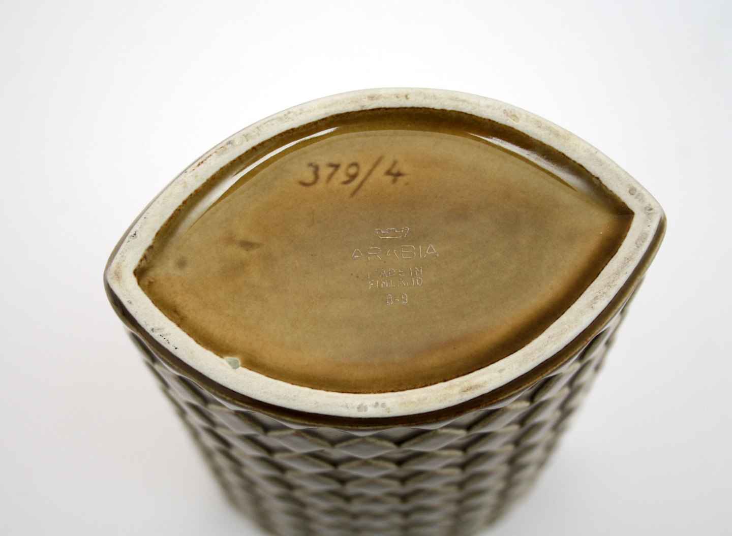 Arabia, Finland, Harlekiini vase i sennepsgul glaseret porcelæn. Designet af Kaarina Aho i 1960'erne. Formnr. 379/4. Højde 21 cm. Længde 12 cm. Bredde 7,5 cm. Flot stand. Pris: solgt