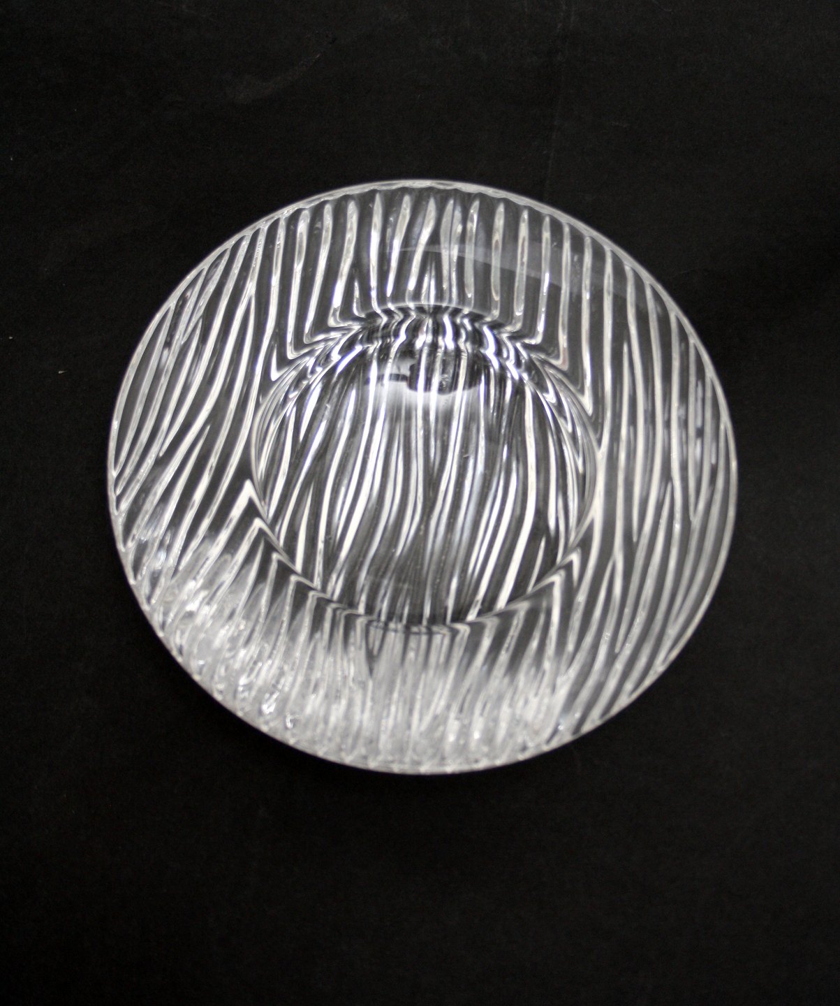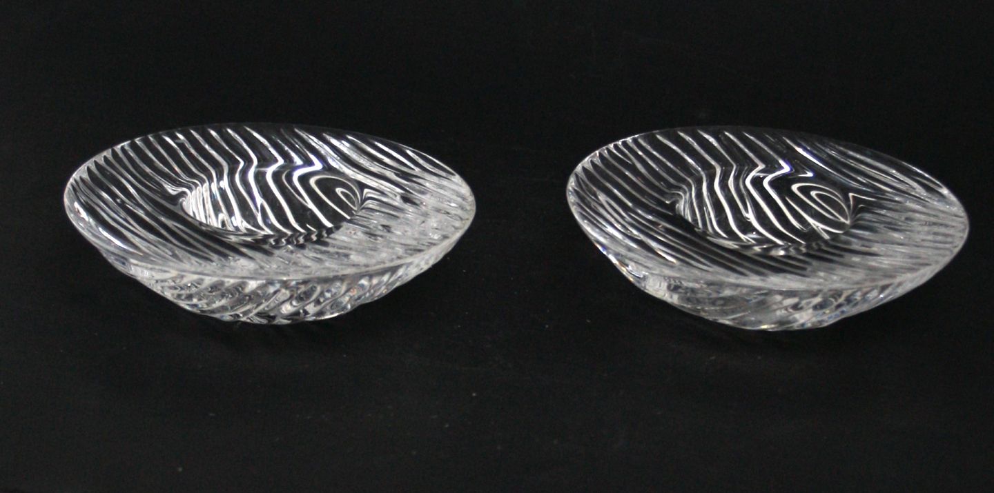 Holmegaard, Water. Designet af Peter Svarrer 2002. Fyrfadsstage. Højde 3 cm. Diameter 11 cm. Pris: 125 kr. stk. Lager: 3 Bloklysstage. Højde 3,5 cm. Diameter 14,5 cm. Pris: 150 kr. stk. Lager: 1