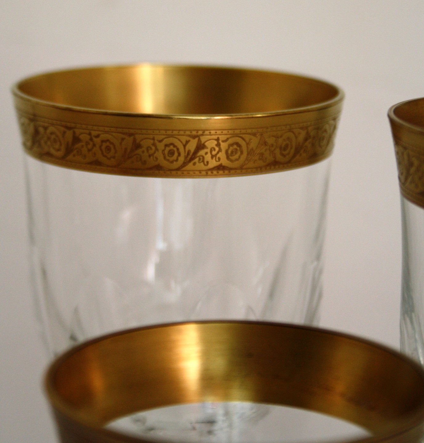 Bohemia, Jessie 24 % håndslebne krystal glas med 14 karat guldbort med cisseleringer udenpå og glat indvendig. Kumme med oliveslibning, facetslebet stilk med rund slebet knop. Eksklusivt bøhmisk glas produceret i området omkring Prag. Glassene er fra slut 1970'erne til starten af 1980'erne og i flot stand.
