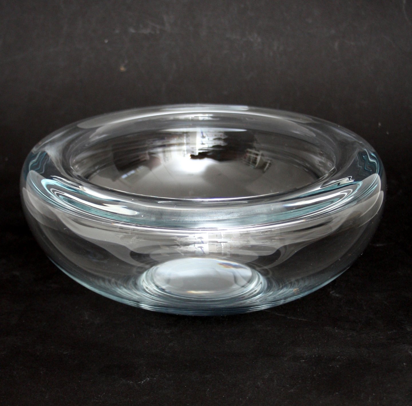 Flad skål svag blålig tone. Diameter 24 cm. Højde 10 cm. Pris: 325 kr.