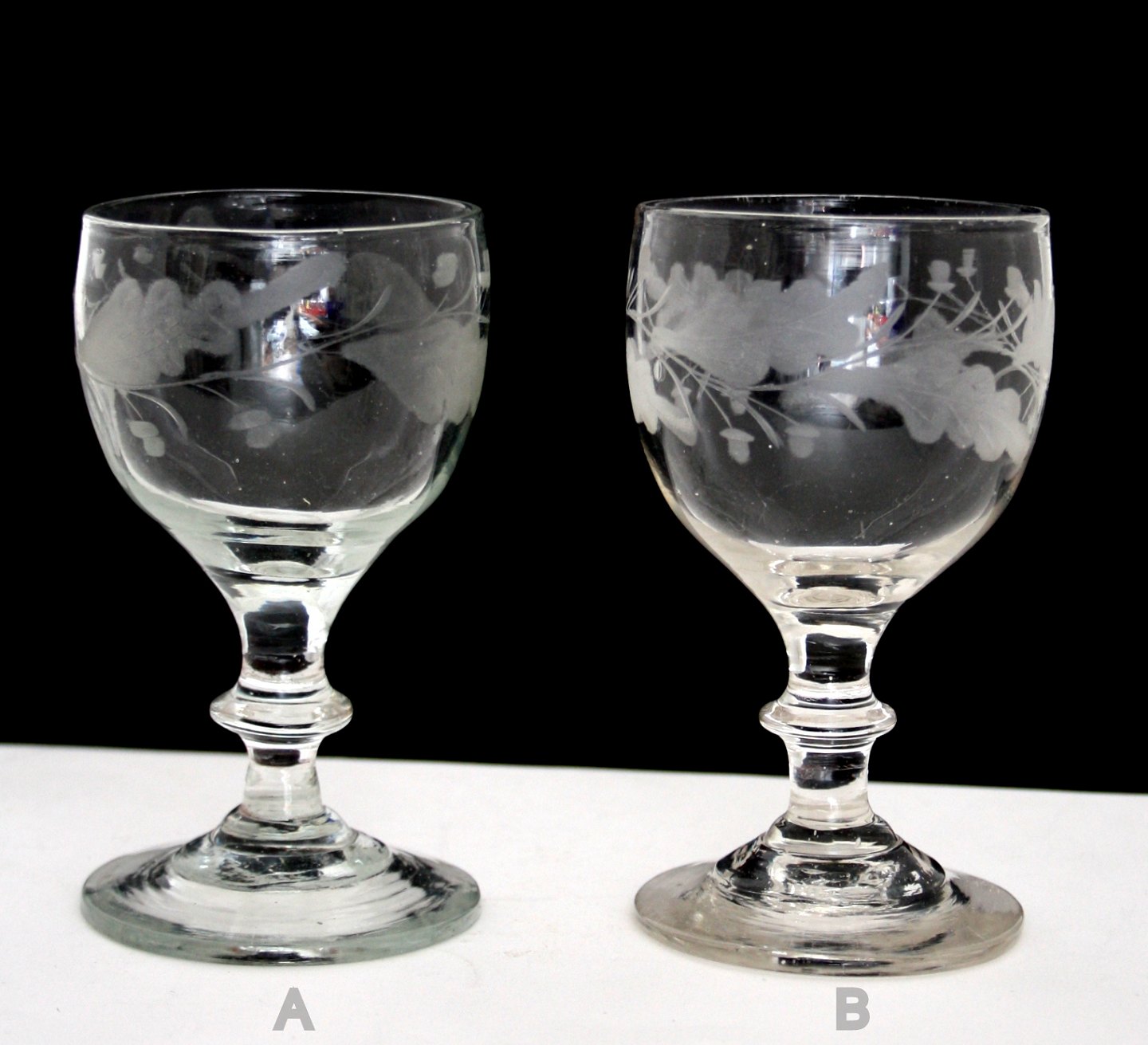 Antagelig Holmegaard glasværk, Egeløv vinglas fra 1853 kataloget. 4 syvfligede fjerlappede blade, der peger med spids skiftevis opad og nedad. 2 agern placeret skiftevis over og under hvert blad. Knækket i bund. Pæn og hel stand.