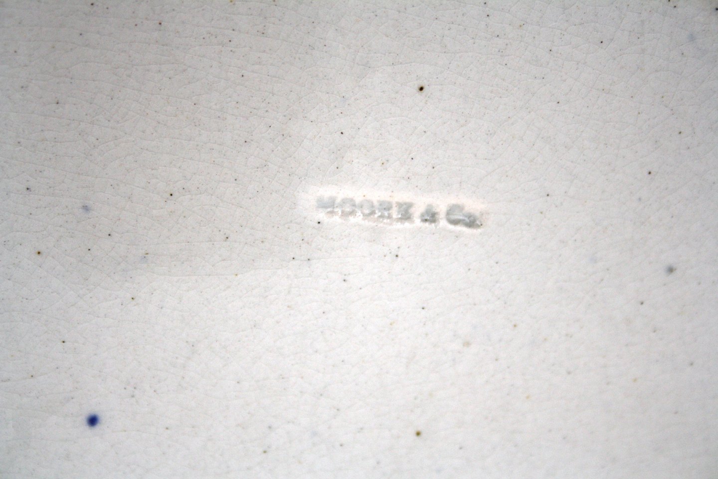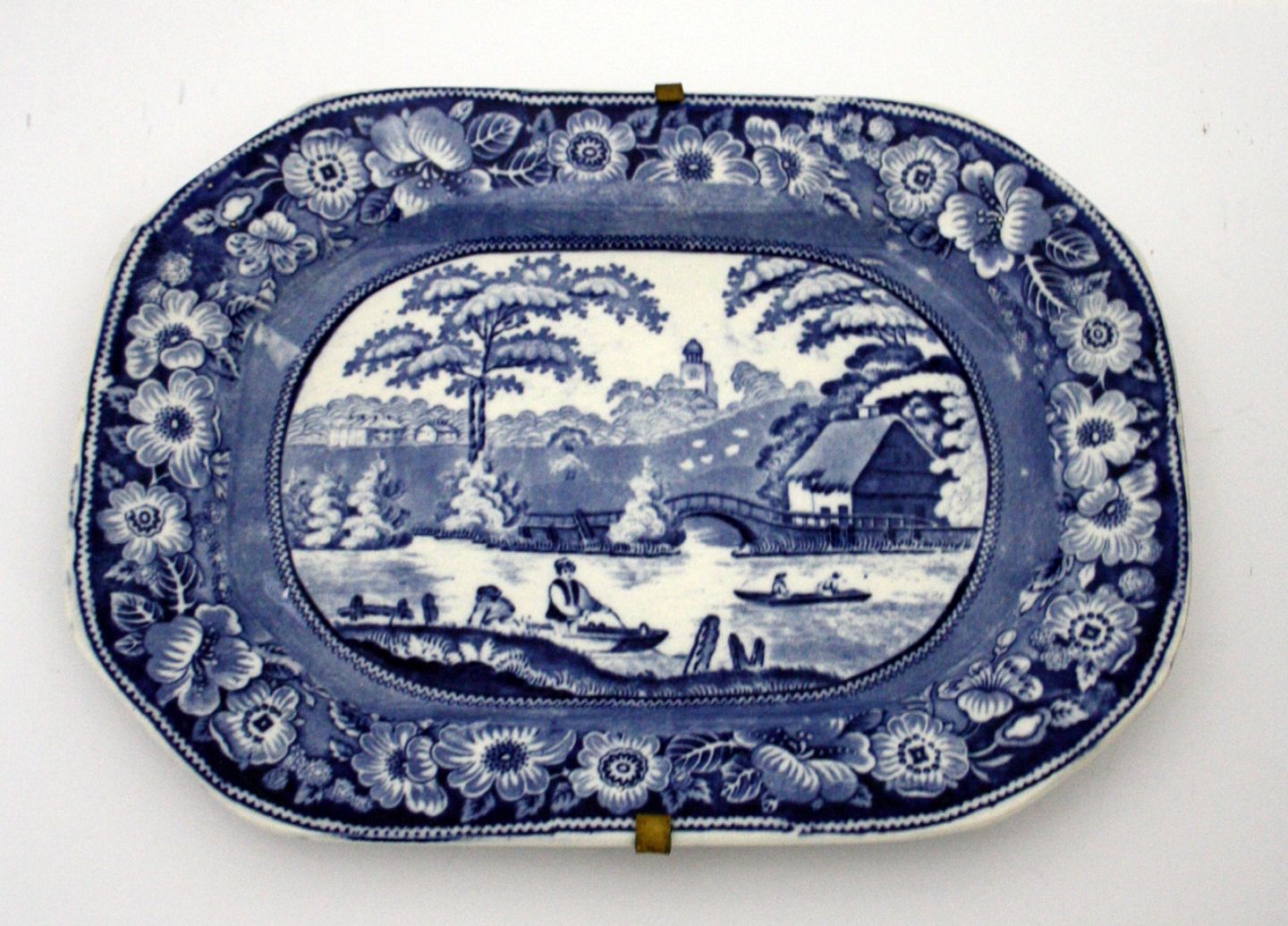 Moore & Co, Old Foley Pottery, Longton, Staffordshire. Flot intakt fajance fad med motiv af sejlende folk på flod og landskab. Mærket er fra perioden 1872-1892. Fadet er monteret med gammelt metalophæng. Fadet er i usædvanlig flot stand uden skår og kun med meget fine krakeleringer. Længde 33 cm. Bredde 24 cm. Pris: 650 kr.