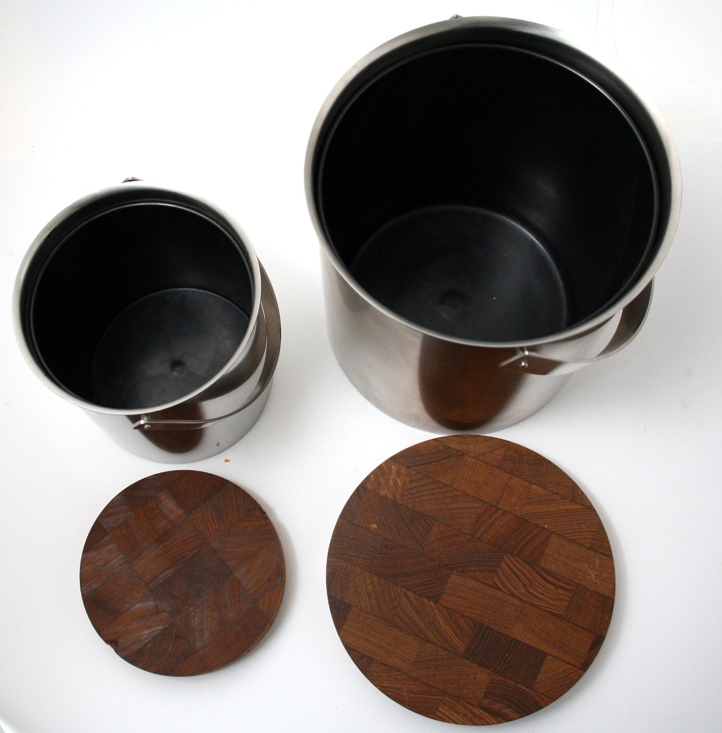 Isspand. Højde 14,5 cm. Diameter 13,5 cm. Indvendig sort plastic. Trælåg. Pris: 375 kr.