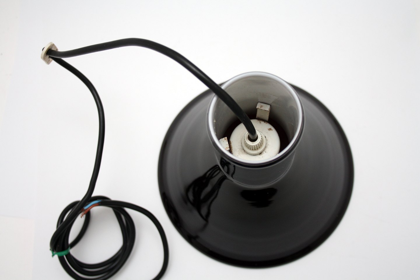 Holmegaard, P&T pendel aubergine/sort, hvid indvendig. Højde 22 cm. Diameter 20 cm. Pris: SOLGT