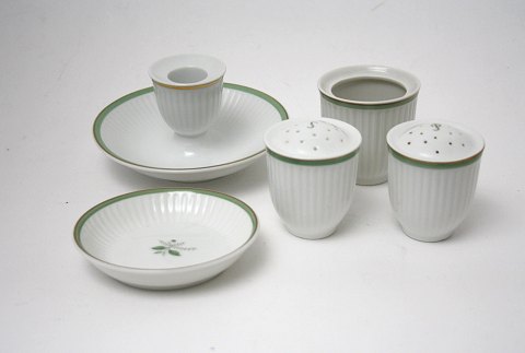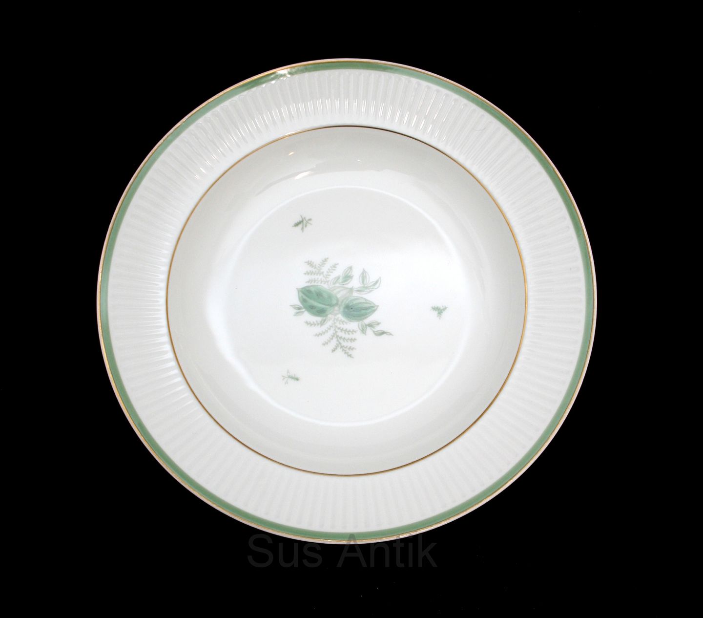 Royal Copenhagen, Grøn Melodi designet af Thorkild Olsen i 1950'erne. Hvidt riflet stel med guldkant og motiver i grønt. Dekorationsnr. 1513. Dyb frokosttallerken stor. Formnr. 14062. Diameter 23 cm. I. sortering. Pris: 150 kr. stk. Lager: 22