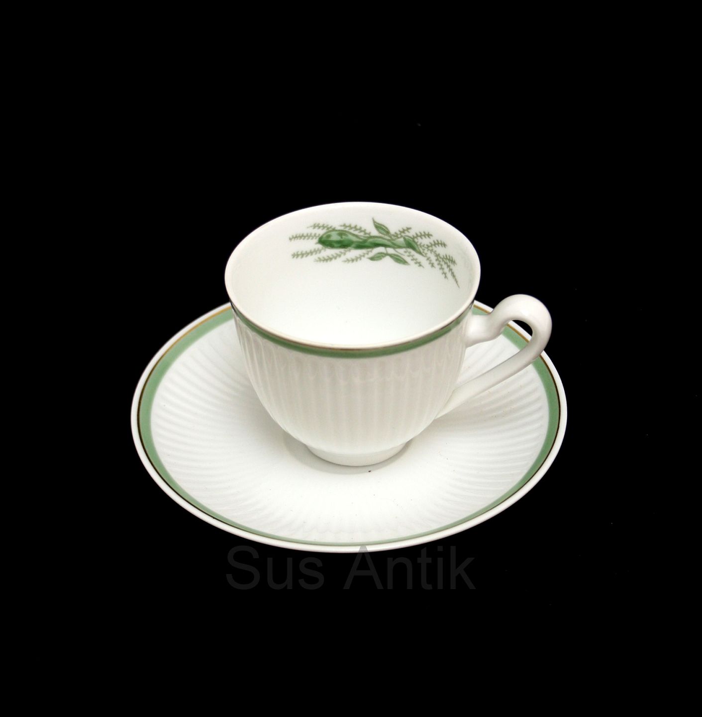 Royal Copenhagen, Grøn Melodi designet af Thorkild Olsen i 1950'erne. Hvidt riflet stel med guldkant og motiver i grønt. Dekorationsnr. 1513. Kaffekop med underkop. Formnr. 99562. Højde 6,5 cm. I. sortering. Pris: 150 kr. stk. Lager: 4