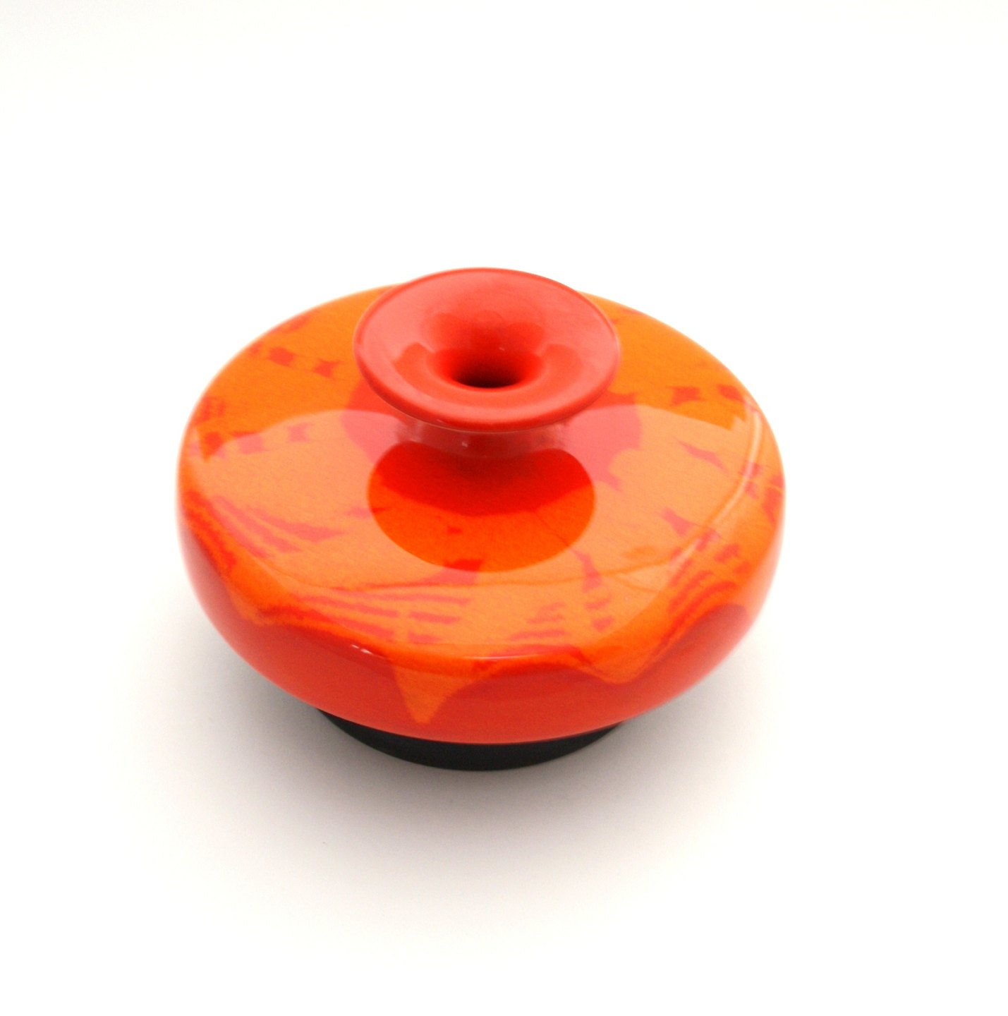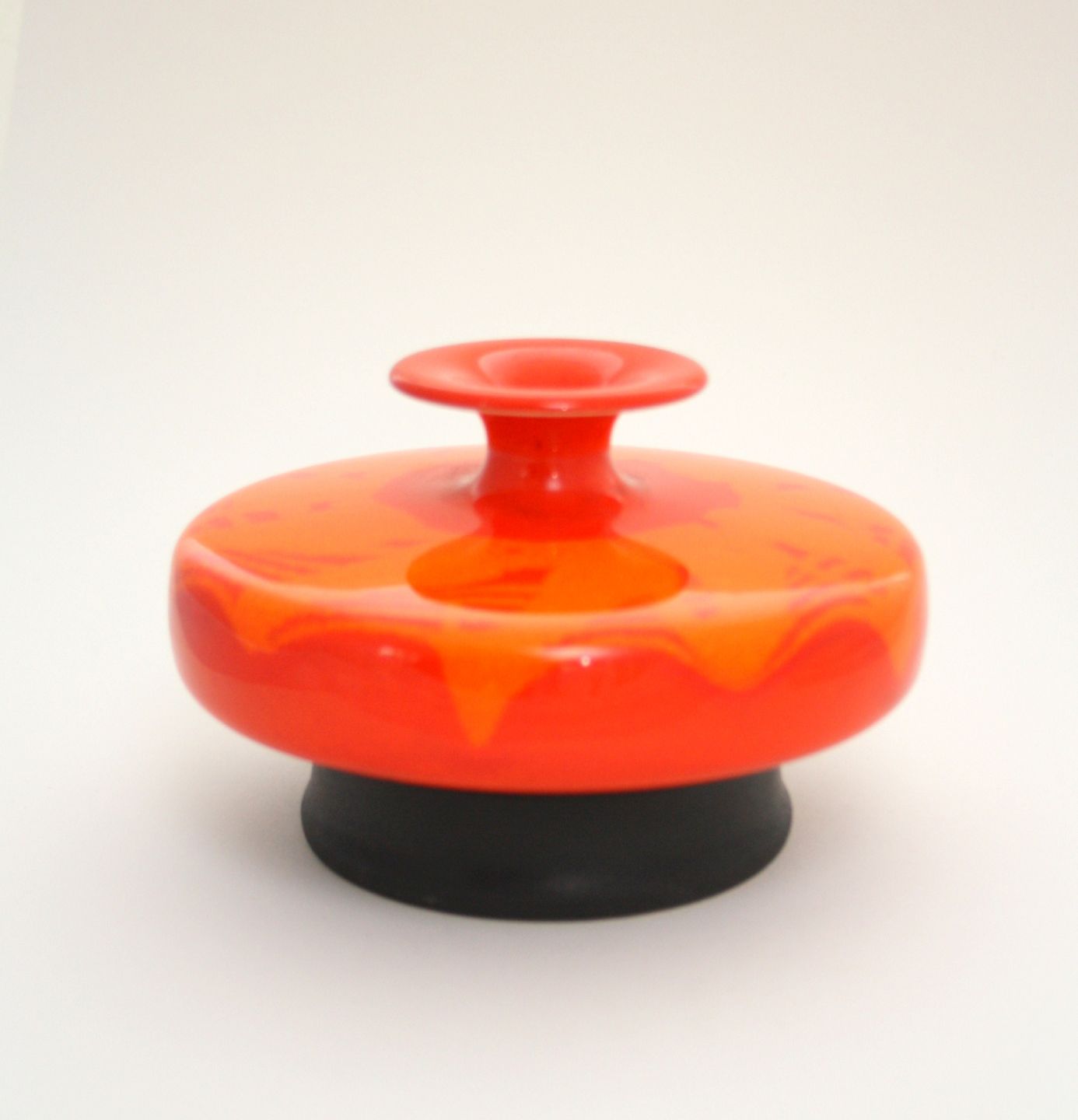 Hutschenreuter Keramik (HK), West Germany, Flad rund vase orange glasur, sort mat glasur i bund. Højde 10,5 cm. Midterste diameter 15 cm. Pris: SOLGT
