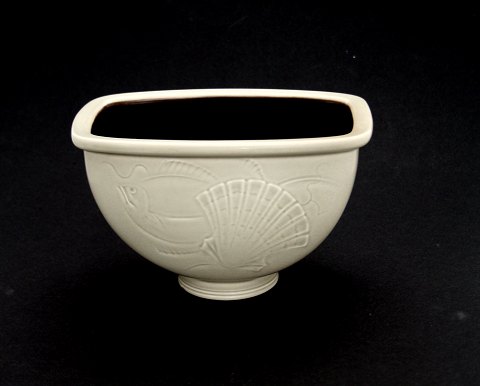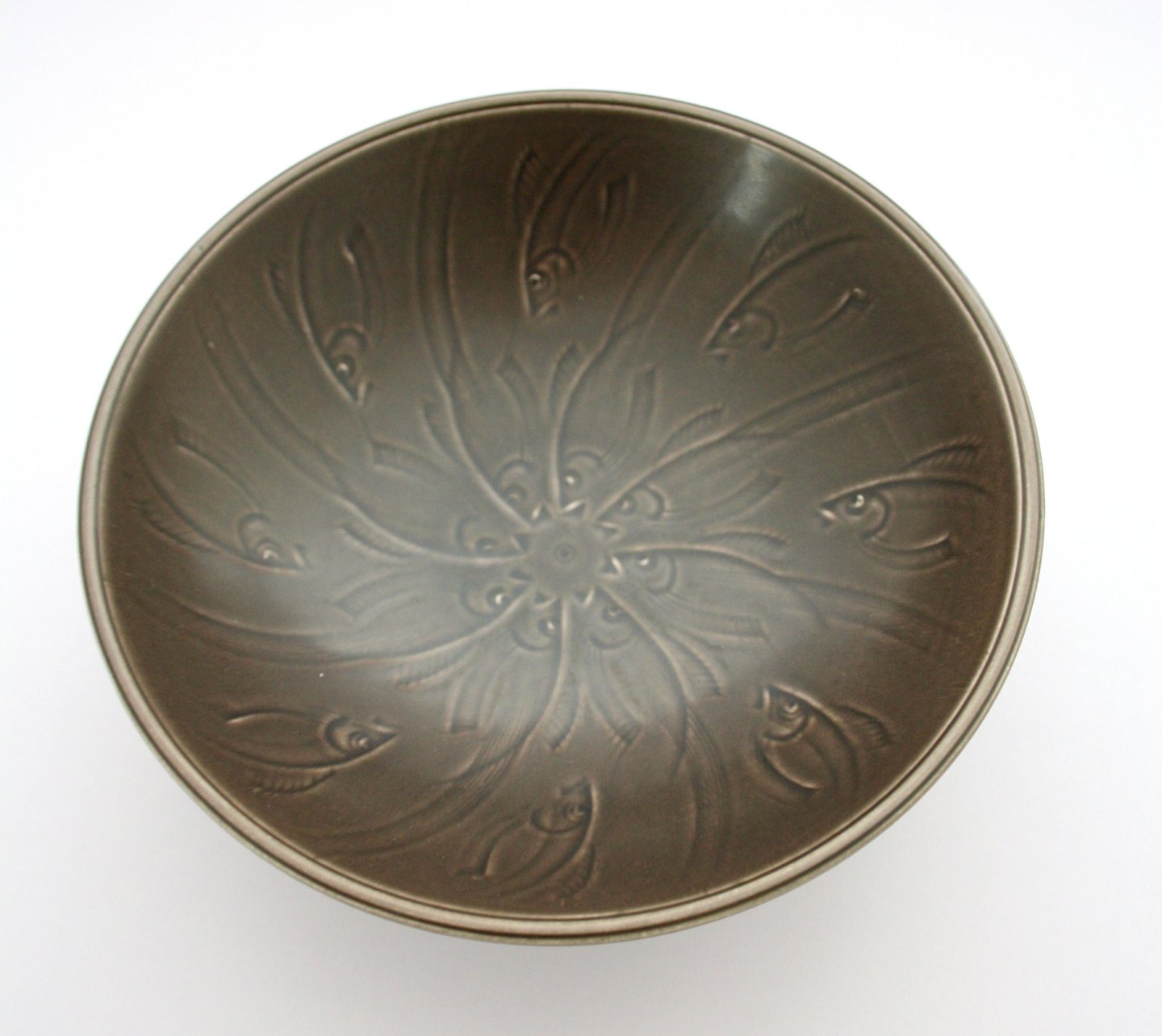 Aluminia, Solbjerg kunststengods fra 1934 designet af Nils Thorsson. Brun skål med fisk indridset i selve originalformen. Glasuren er mat. Formnr. 1585. Diameter 18 cm. Højde 6,3 cm.