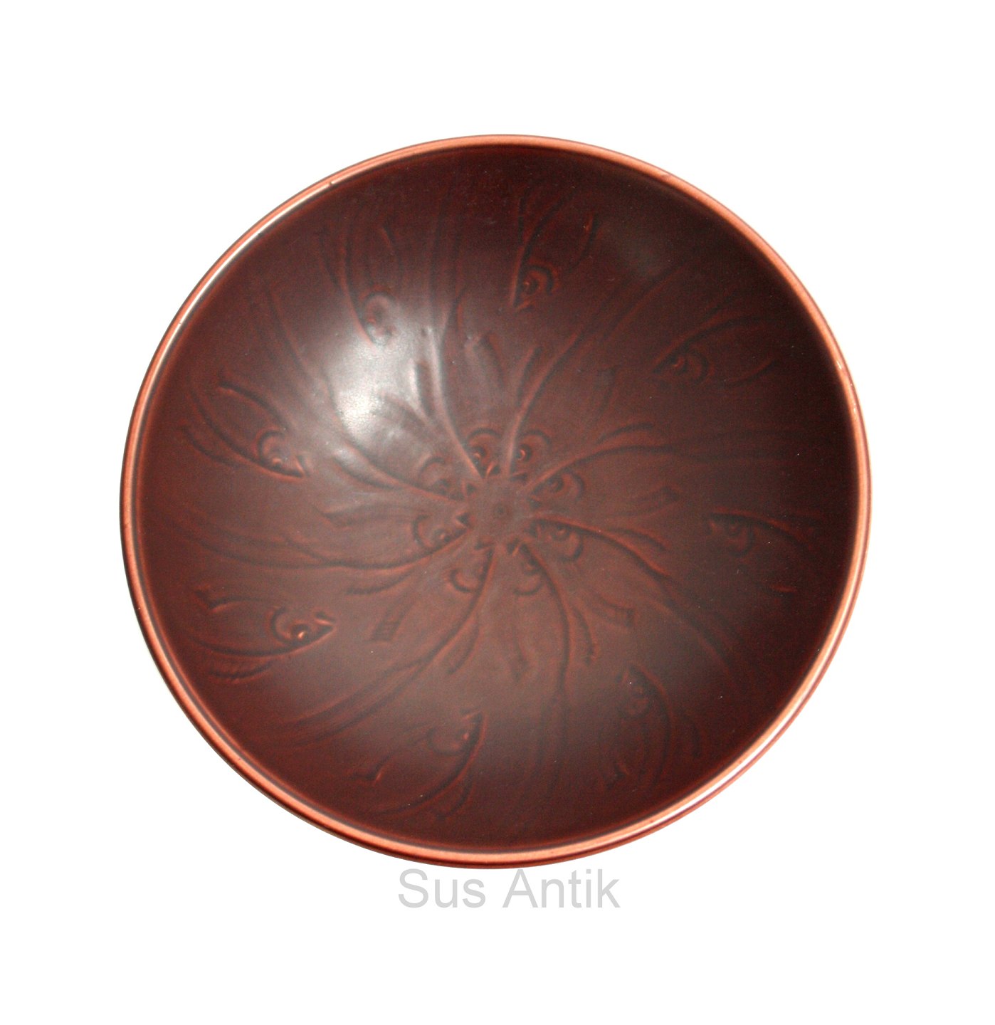 Aluminia, Solbjerg kunststengods fra 1934 designet af Nils Thorsson. Rødbrun skål med fisk indridset i selve originalformen. Glasuren er mat. Formnr. 1585. Diameter 18 cm. Højde 6,3 cm. Pris: 350 kr. stk. Lager: 1