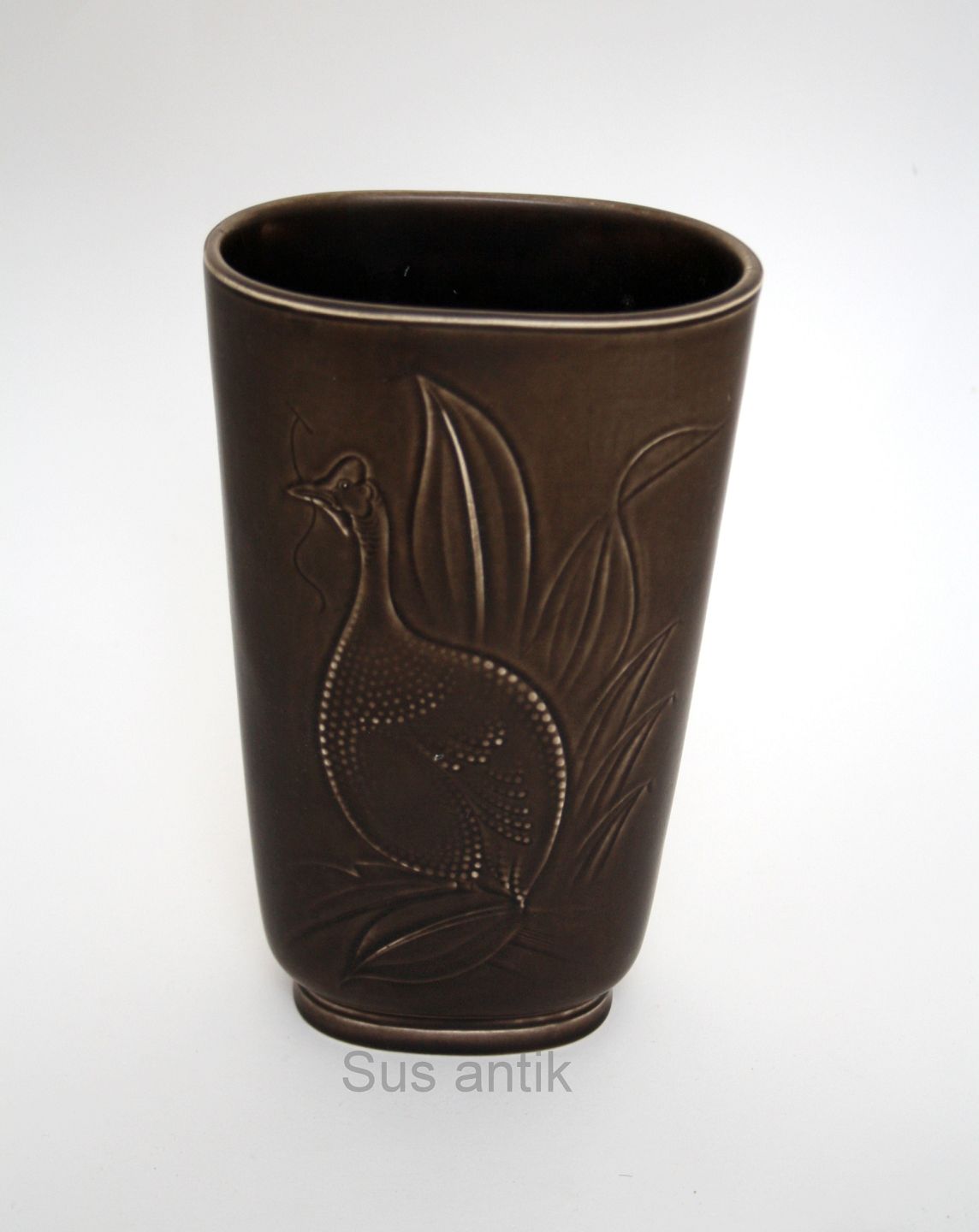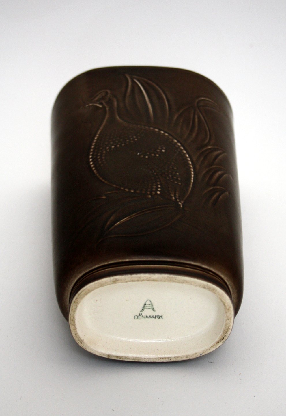 Aluminia, Solbjerg kunstserie i matte ensfarvede glasurer designet af Niels Thorsson i perioden 1931/56-1970. Vase i brun mat glasur med motiv af agerhøne og dunhammer. Nr. 1712. Højde 21,5 cm. 9,5 x 14 cm. Pris: 475 kr.