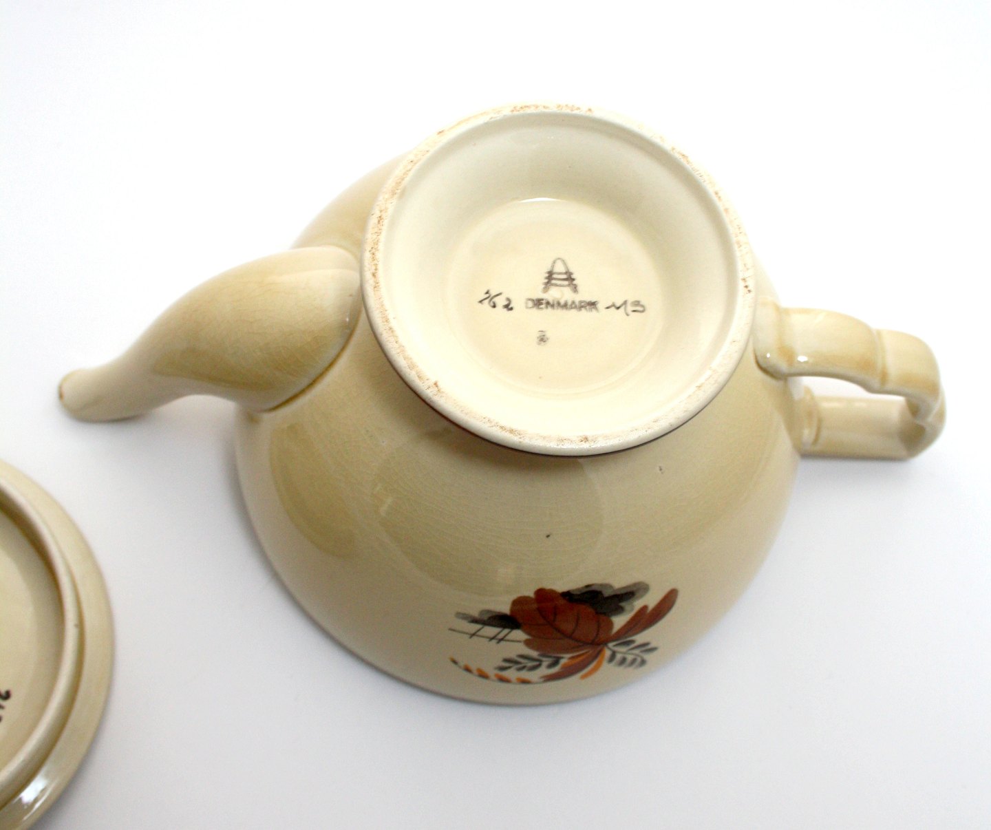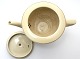 Aluminia fajance. Knud. Design Niels Thorsson. Håndmalet. Produceret i perioden 1934-1963. Tekande med låg. Højde 12 cm. Diameter 15,5 cm. Længde 25,5 cm. Lettere overfladekrakelering udvendig. Brun krakelering indvendig. Lille glasurafslag under tuden yderst. Pris: SOLGT