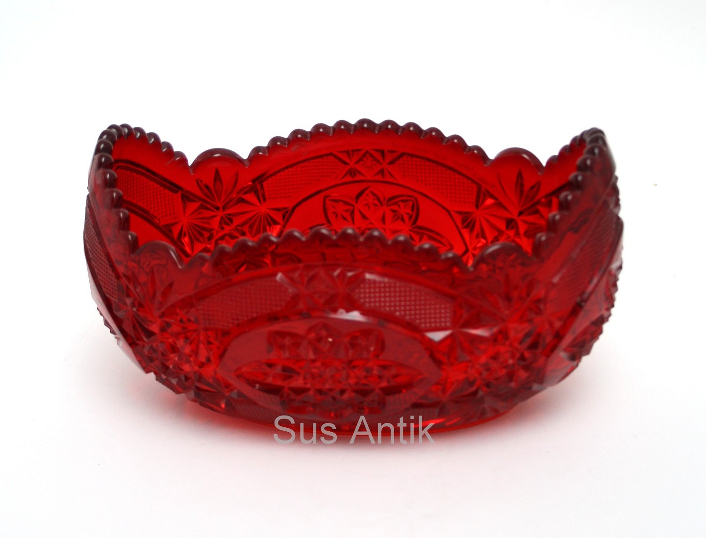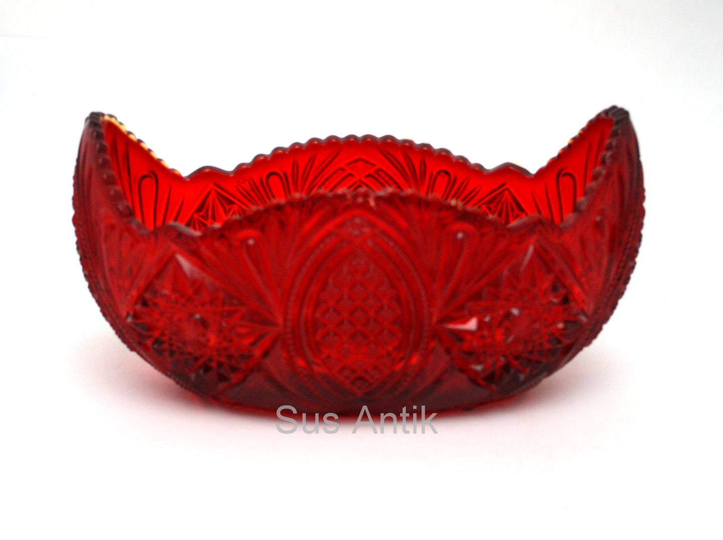 Brockowitz, Tyskland 1915, Jardiniere i rubinrød presset glas i Zürichserien. Længde 23 cm. Bredde 13 cm. Højde 12,5 cm. Fin og hel stand. Pris: 650 kr. stk. Lager: 1