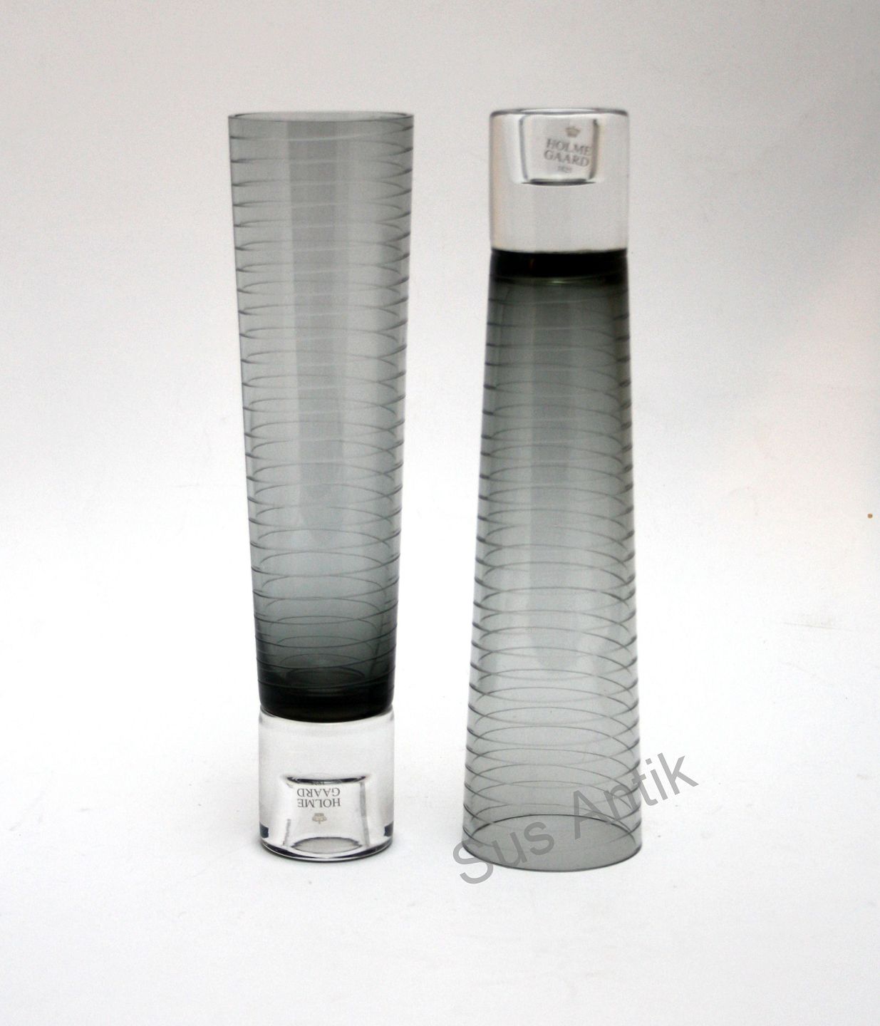 Holmegaard, Groove vendbare vaser og lysestager, smokefarvet med vandrette striber. Designet af Rikke Hagen 2004. Højde 22,5 cm. Vase diameter 5,5 cm. Lysestage diameter 4 cm. Pris: 150 kr. stk. Lager: 2