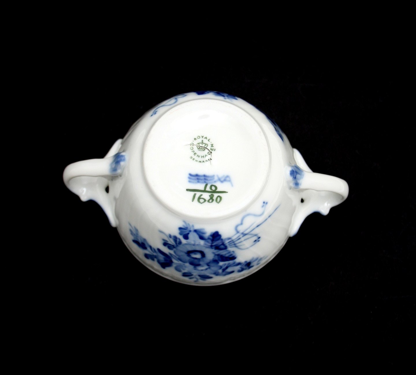 Royal Copenhagen, Blå Blomst svejfet, Lille sukkerskål med låg. Nr. 10/1680. Højde 11 cm. Længde 14 cm. III. sortering medarbejdersortering fin stand. Pris: SOLGT