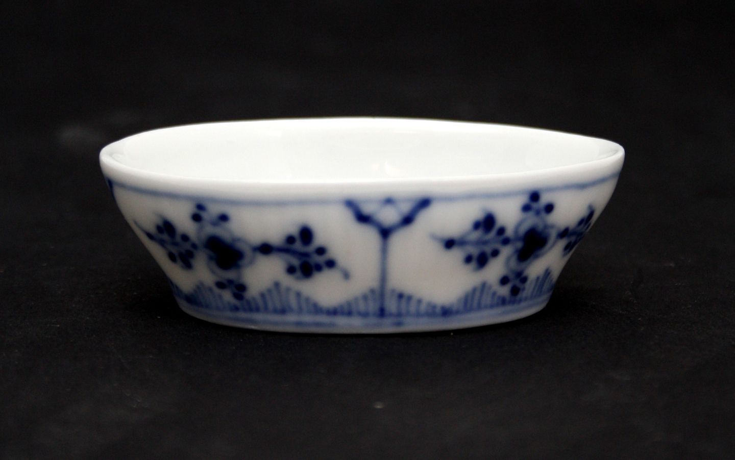Royal Copenhagen, Musselmalet riflet, Saltkar. Nr. 1/2128. Længde 7 cm. Bredde 4 cm. Højde 2 cm. I. sortering. Flot stand. Pris: 425 kr.