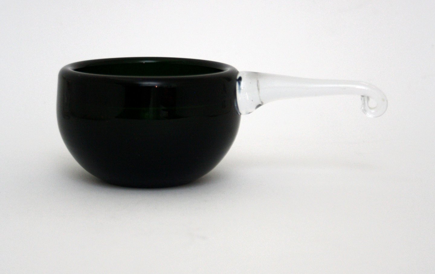 Holmegaard/Fyens glasværk, Palet sildeskål grøn transparent glas med klar hank. Designet af Michael Bang. Tilgår Paletserien i 1976 og udgår samme år, derfor sjælden. Højde 5,5 cm. Diameter 9 cm. Længde 16,5 cm. Pris SOLGT