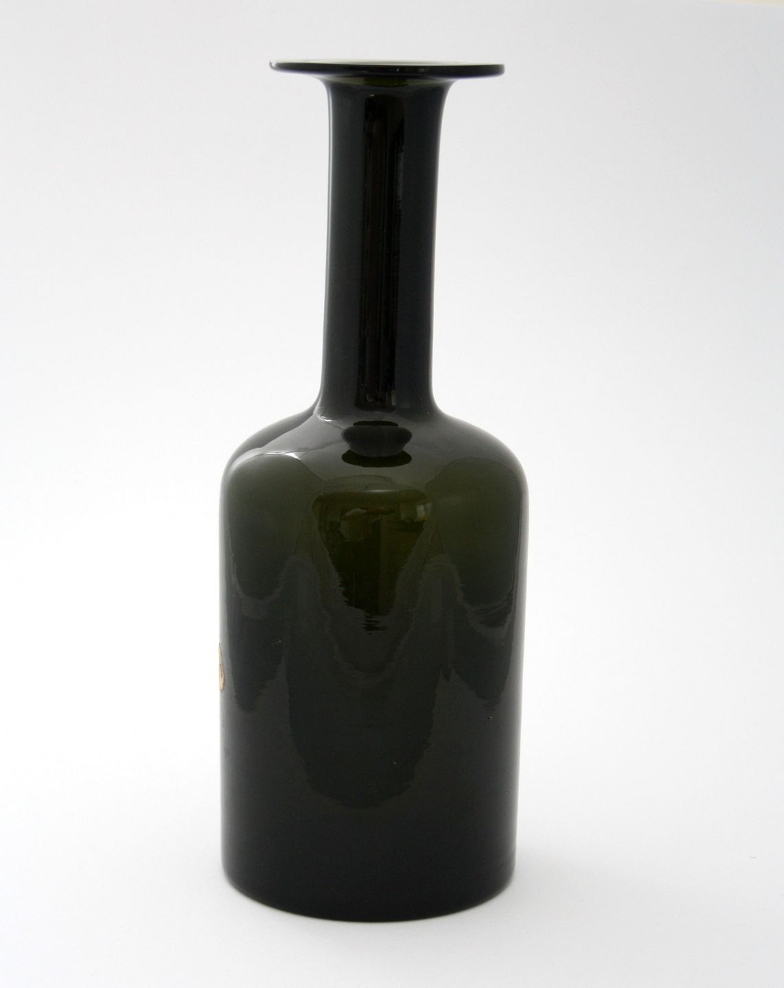 Kastrup-Holmegaard Glasværk, Lille flaskegrøn gulvvase, nr. 1 på ekstrafoto. Højde 25,5 cm. Designer Otto Brauer 1959. Almindelig brugsspor. Pris: SOLGT