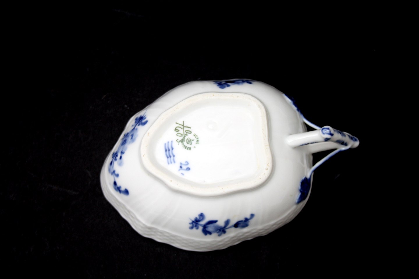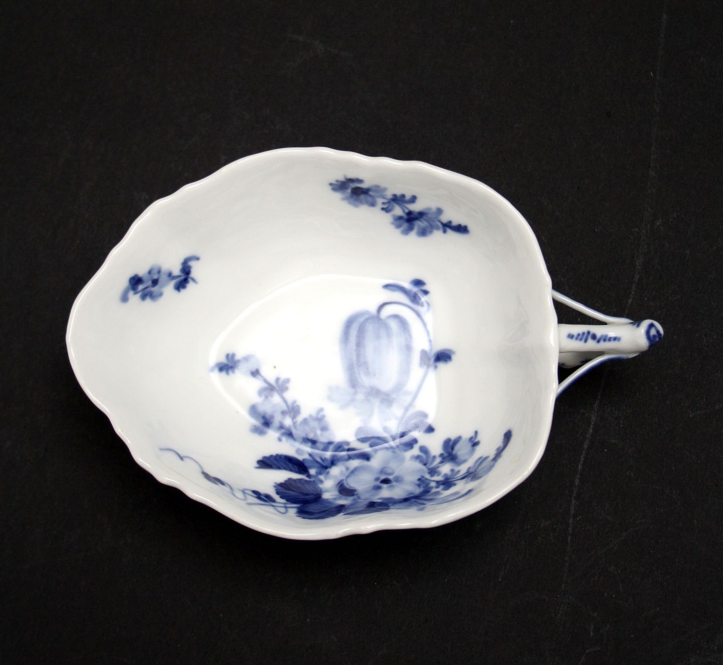 Royal Copenhagen, Blå Blomst Svejfet, Kande/næb/skål med hank. Nr. 10/1603. Produceret mellem 1898-1923. Længde 15 cm. Bredde 10 cm. Højde 4 cm. I. sortering. Pris: