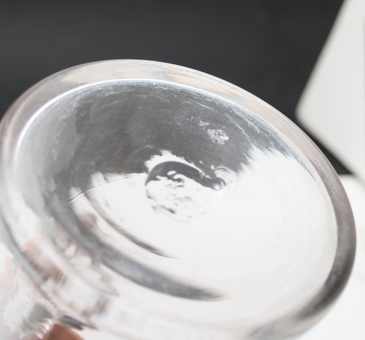 Glaskande med stribet hank og knækket bund antagelig fra starten af 1900 tallet. Højde 22 cm. Diameter bund 10 cm. Brugsslid i form af enkelte ridser. Pris: 425 kr. stk. Lager: 1