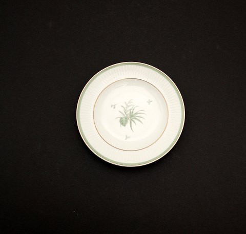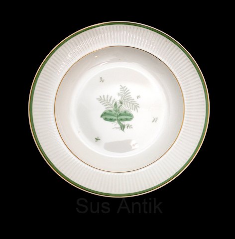 Royal Copenhagen, Grøn Melodi designet af Thorkild Olsen i 1950'erne. Hvidt riflet stel med guldkant og motiver i grønt. Aflangt fad. Nr. 1513/14055. Længde 27,7 cm. Diameter 19 cm. I. sortering. Pris: 375 kr. Lager: 1