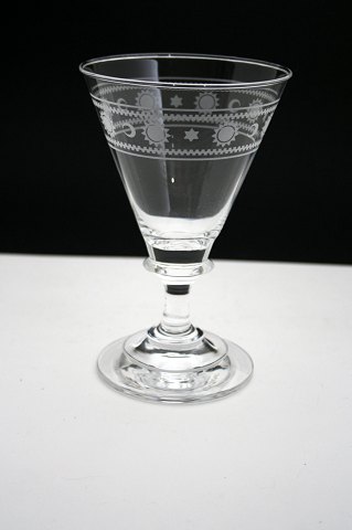 Glas med rund kumme og slebne motiver og kraftig firkantet slebet fod. Bunden har opstukket "blomst" med runde kronblade. Enkelte med mindre afslag på fod.