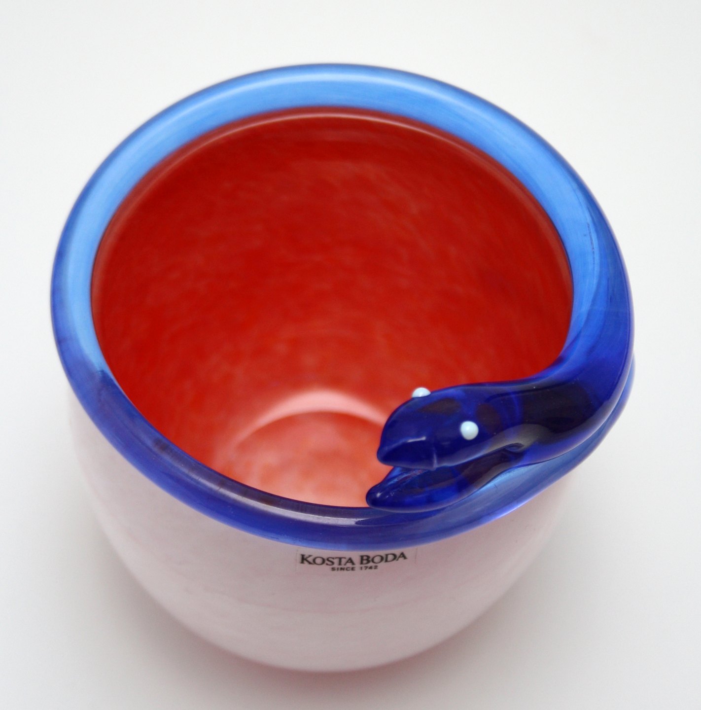 Kosta Boda, Sweden, Snake bowl, skål med blå slangekant, hvid udvendig og rød indvendig. Designet af Ulrica Hydman Vallien. Signeret Kosta Boda atelier Ulrica HV. Højde 12 cm. Øverste diameter 10 cm. Flot stand. Pris: 1600 kr.