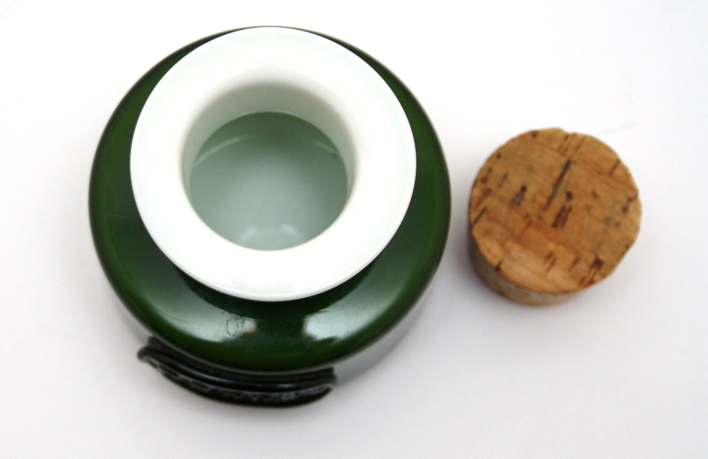 Holmegaard, Palet, Grøn køkkenserie, krydderikrukke med korkprop Carry. Designet af Michael Bang i 1970, udgår i 1976. Højde med prop ca. 8,5 cm. uden prop ca. 6,5 cm. Pris: 225 kr.