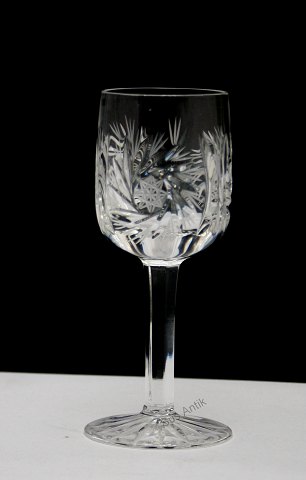 Lyngby glasværk, Granada, Hvidvin. Mundblæst og håndslebet 24 % Bøhmisk blykrystal med slibninger på kumme, slebet stilk og stjerneslebet fod. Importeret fra Tjekkiet i 1970'erne og solgt via Lyngby glasværk.