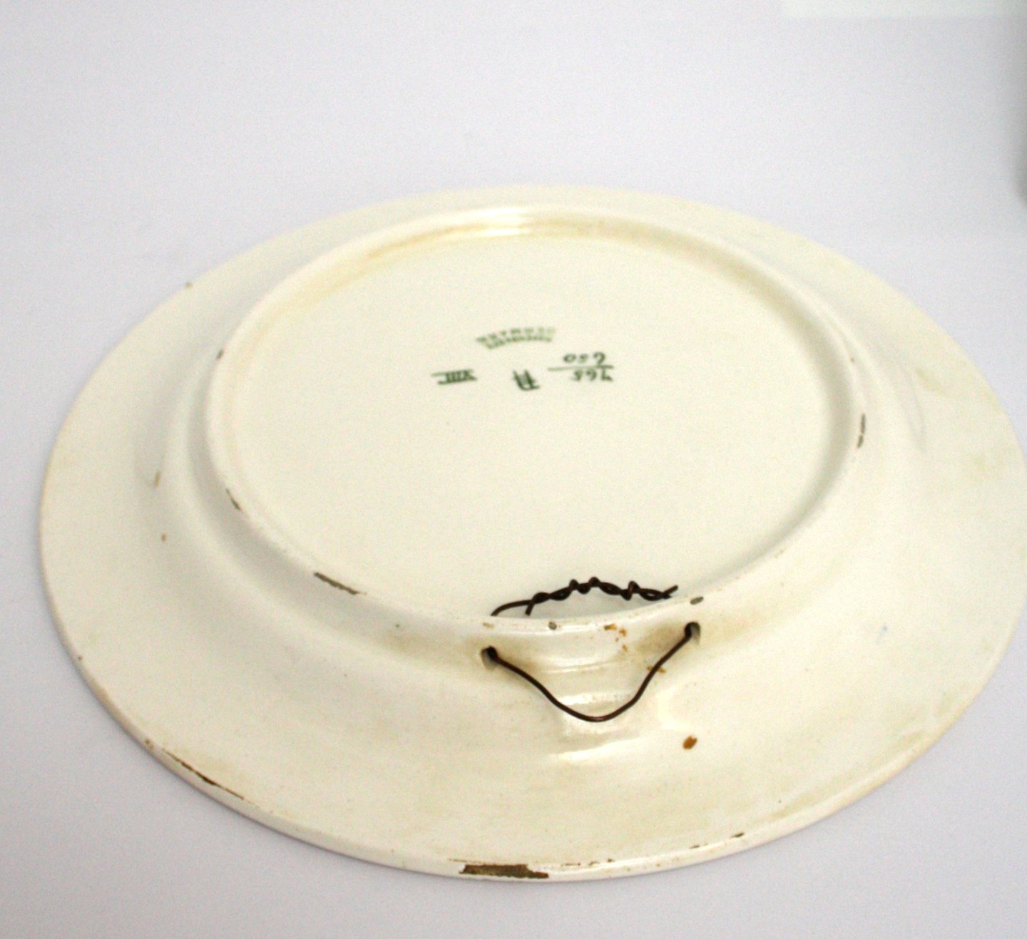 Aluminia, juleplatte 1910. Nr. 765/650. Motiv i relief: 3 engle der ringer med klokker. Designet af Rasmus Harboe. Diameter 30 cm. Højde 3 cm. Flot stand med begrænset overfladekrakelering og glasurafslag på bagsiden. Pris: 975 kr. stk. Lager: 1