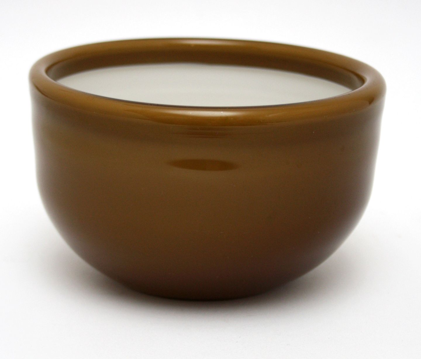 Holmegaard, Palet, Skål i Umbrafarvet omfang og indvendig hvid glas. Designet af Michael Bang i 1973 udgår i 1976. Sorte streger indvendig ellers fin stand. Diameter 13,5 cm. Højde 8 cm. Pris: 300 kr.