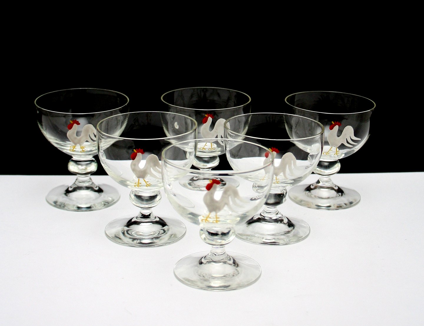 Holmegaard Glasværk, Cocktail glas med emaljebemalet hvid hane. Designet af Jacob E. Bang og fremstillet på Malerstuen i Nyhavn 12 i perioden 1937-1957. Cocktailglas/Likørglas. Højde 7,5 cm. Diameter 7 cm. Pris: SOLGT