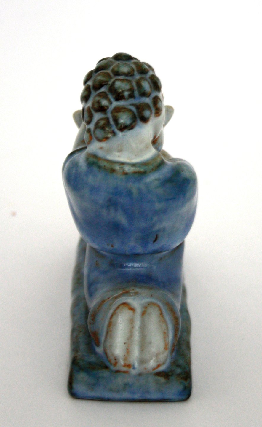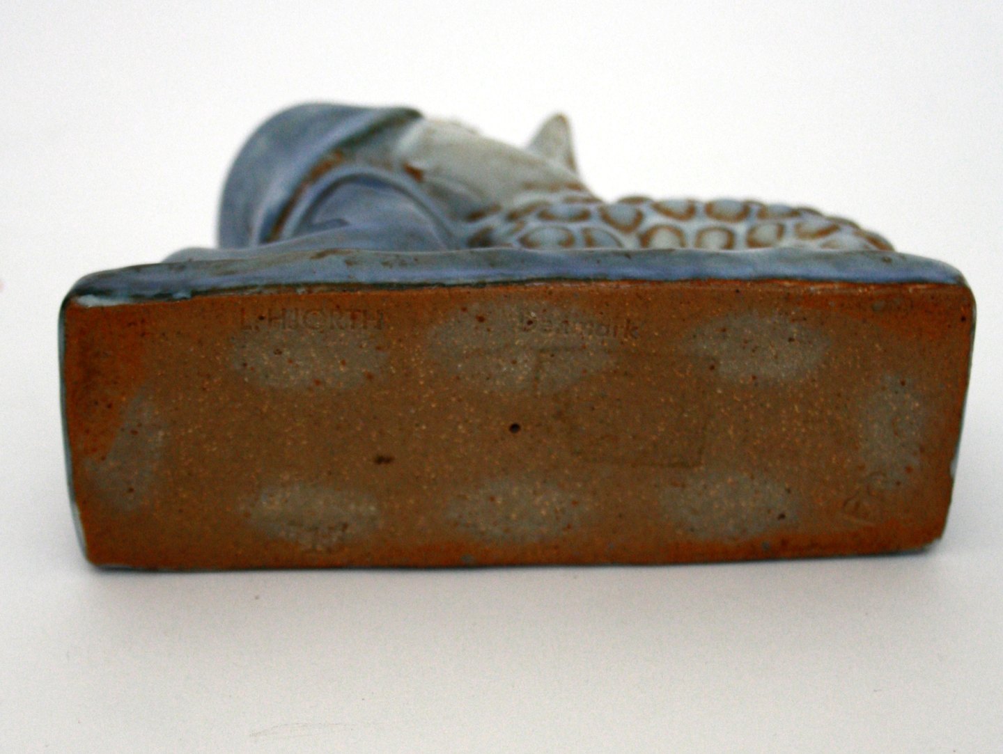 L. Hjorth, Bornholm, Pige med lam, blåglasseret keramik. Designet af Gertrud Kudielka (1896-1984). Stempel L.Hjorth, Danmark, 515. Højde 10,5 cm. Længde 12 cm. Flot stand. Pris: 675 kr.