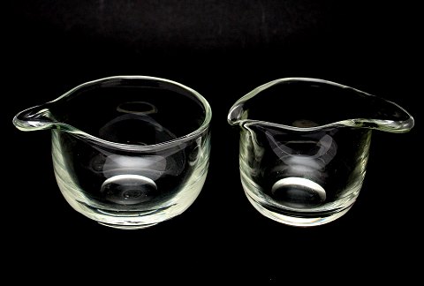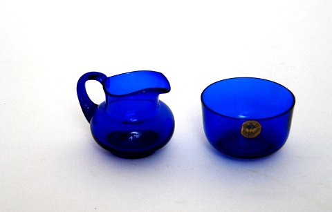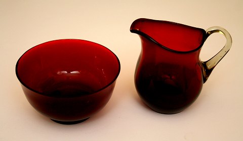 Fyens Glasværk, Sukkerstel i rødt ternet mønster i presset glas. Fyens Glasværk katalog 1924 nr. 196. Sukkerskål højde 13 cm. Diameter 11 cm. Flødekande højde 10,6. Lille flig/produktionsfejl på kanten. Fin stand. Pris: Sælges samlet 675 kr.