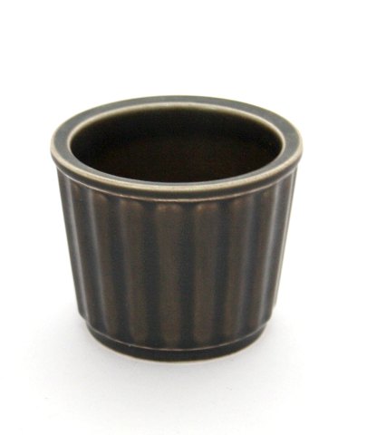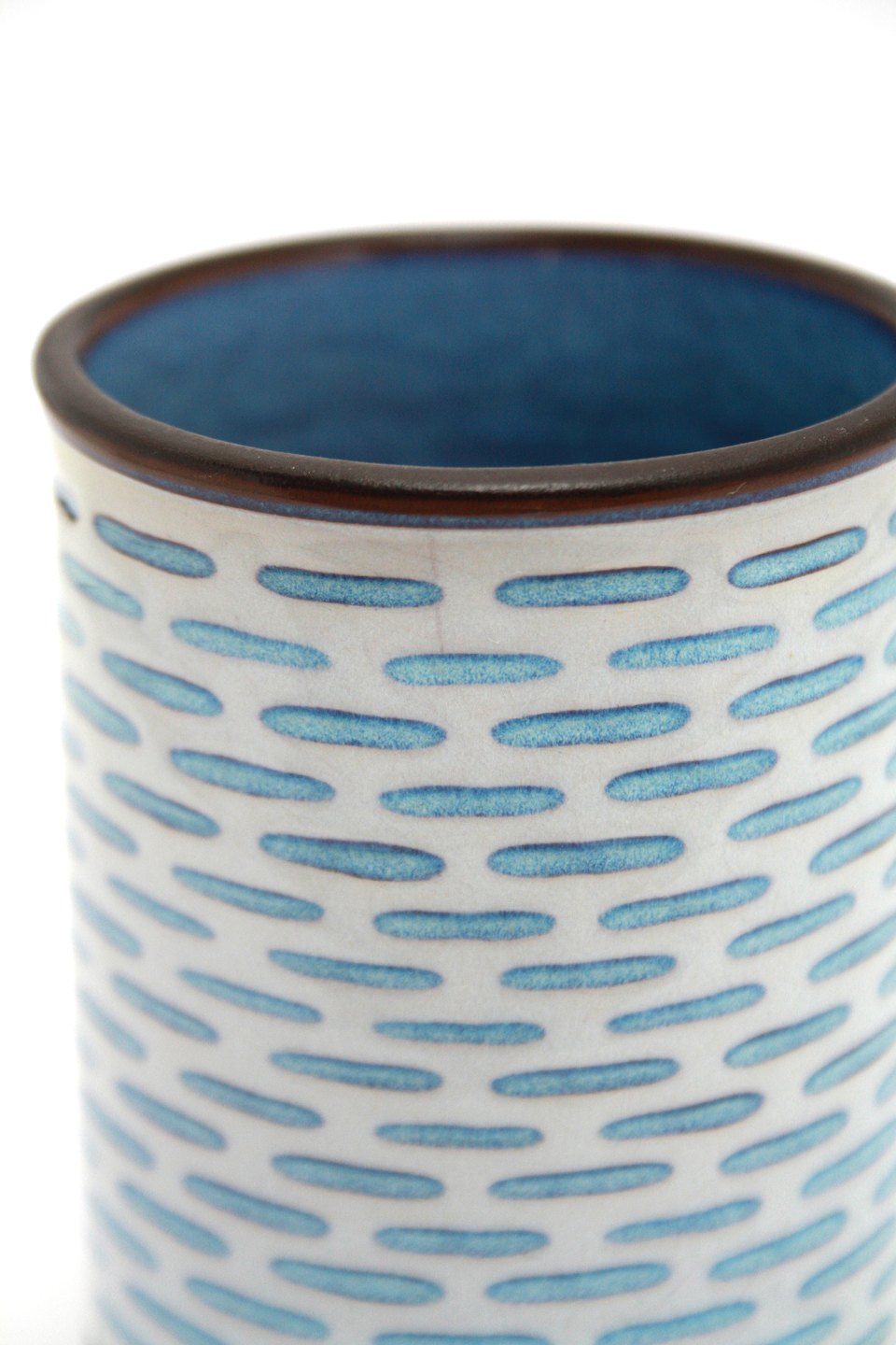 Aluminia, Thule kunstfajance med begittet brun skærv og lyseblå mønster på hvid bund. Designet af Anni Jeppesen i 1962. Cylinderformet vase. Nr. 3174. Højde 11 cm. Diameter 7 cm. Fin stand med en enkelt udvendig glasur revne. Pris: 275 kr.